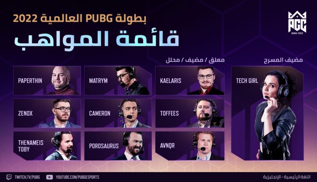 كما هو الحال دائمًا، ستتم إذاعة PGC 2022 باللغة الإنجليزية مع أفضل المواهب والمذيعين فيPUBG Esports. سيتم توفير اللغات الأخرى أيضًا لجميع محبي PUBG esports من جميع أنحاء العالم.