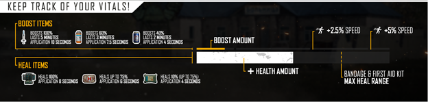 حقيبة الإسعافات الأولية: حقيبة الإسعافات الأولية أقل شيوعًا، ولكنها عنصر شفاءٍ أقوى من الضمادات. يجب استخدامها فقط عند التعرض لضرر فعلي، وإلا ضمدوا أنفسكم بضمادة. يستغرق هذا الطقم ما يصل إلى 6 ثوانٍ، لذا من الأفضل الاحتماء قبل استخدامها. تستعيد حتى 75% من الصحة خلال ثانيتين.