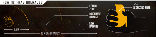 قنبلة يدوية – هذه هي التي تصنع انفجارًا وتسبب الضرر حول الانفجار، بالإضافة إلى التسبب في ارتجاج لمن أصيبوا بالقنبلة اليدوية. مفيدة حقًّا لإخراج هذا الشخص الذي لا يظهر بعد الاختباء خلف صخرته.