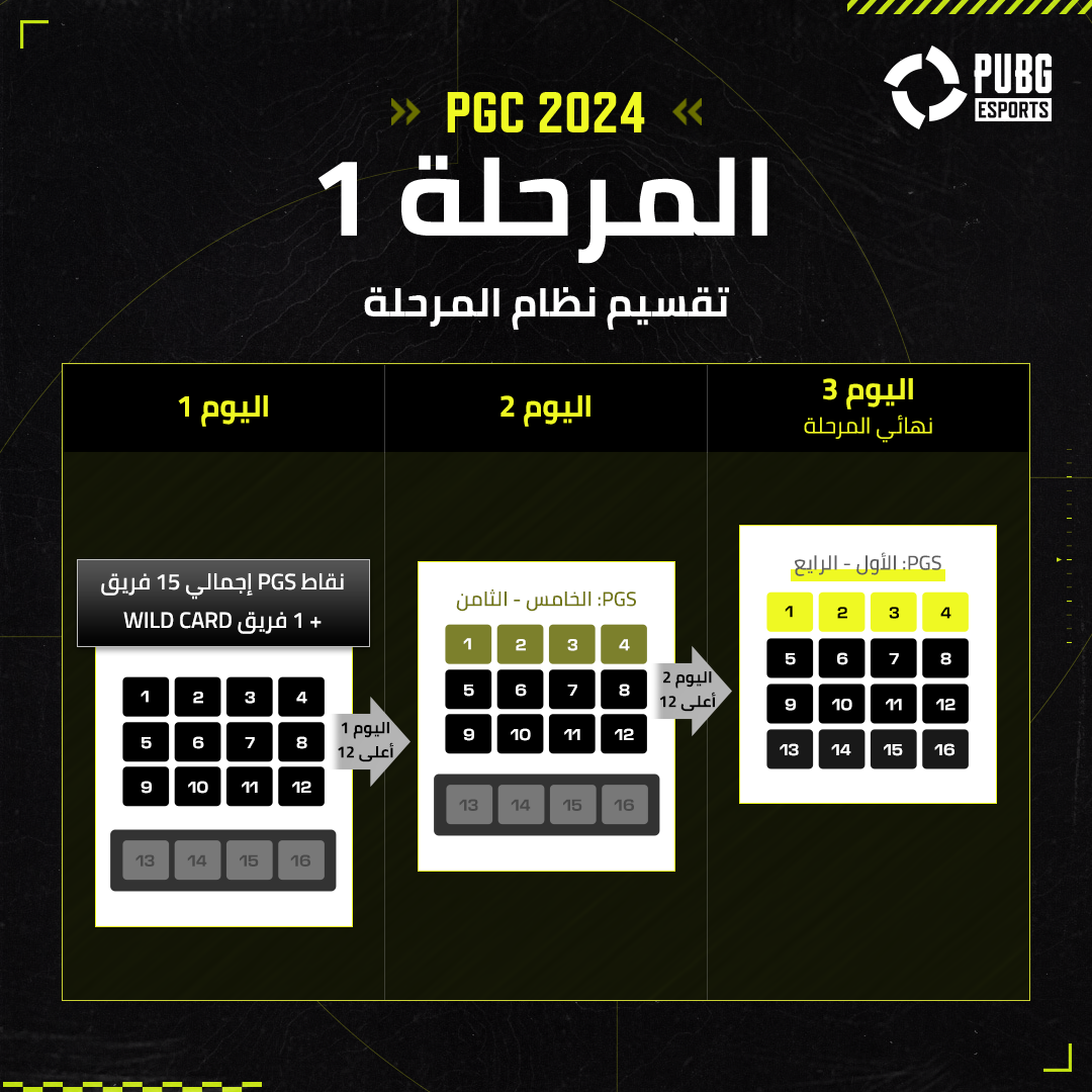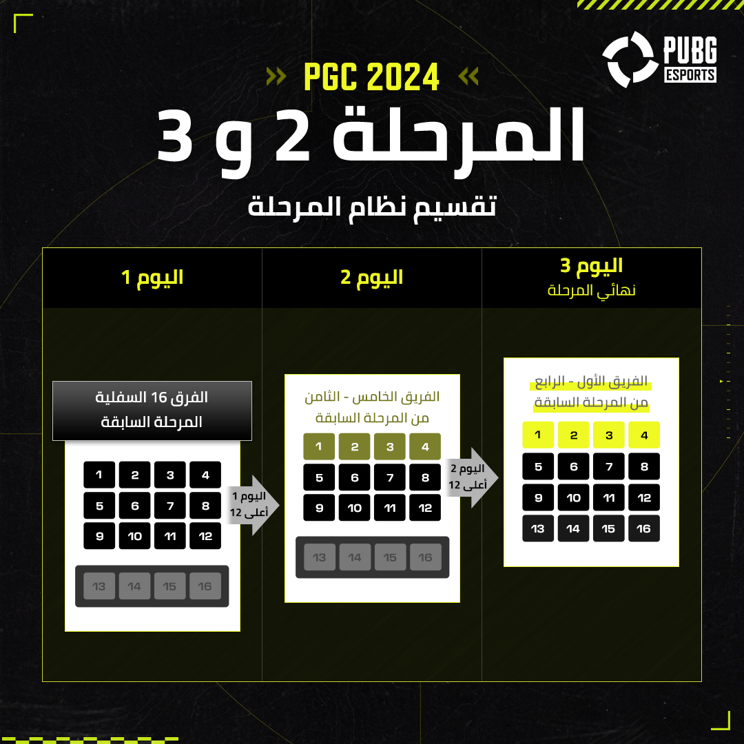 تتكرر هذه العملية على مدار الجولة الثانية والثالثة، مع دخول كل فريق إلى ساحات المعارك بناءً على تصنيفاتهم في الجولة السابقة. ستنضم الفرق الأقل تصنيفًا في اليوم الأول، بينما الفرق الأعلى تصنيفًا في اليوم الثالث. في نهاية الجولة الثالثة، سينتقل أفضل 16 فريقًا حصلوا على أكبر عدد من النقاط في جميع نهائيات الجولات إلى نهائيات PGC 2024 الكبرى.