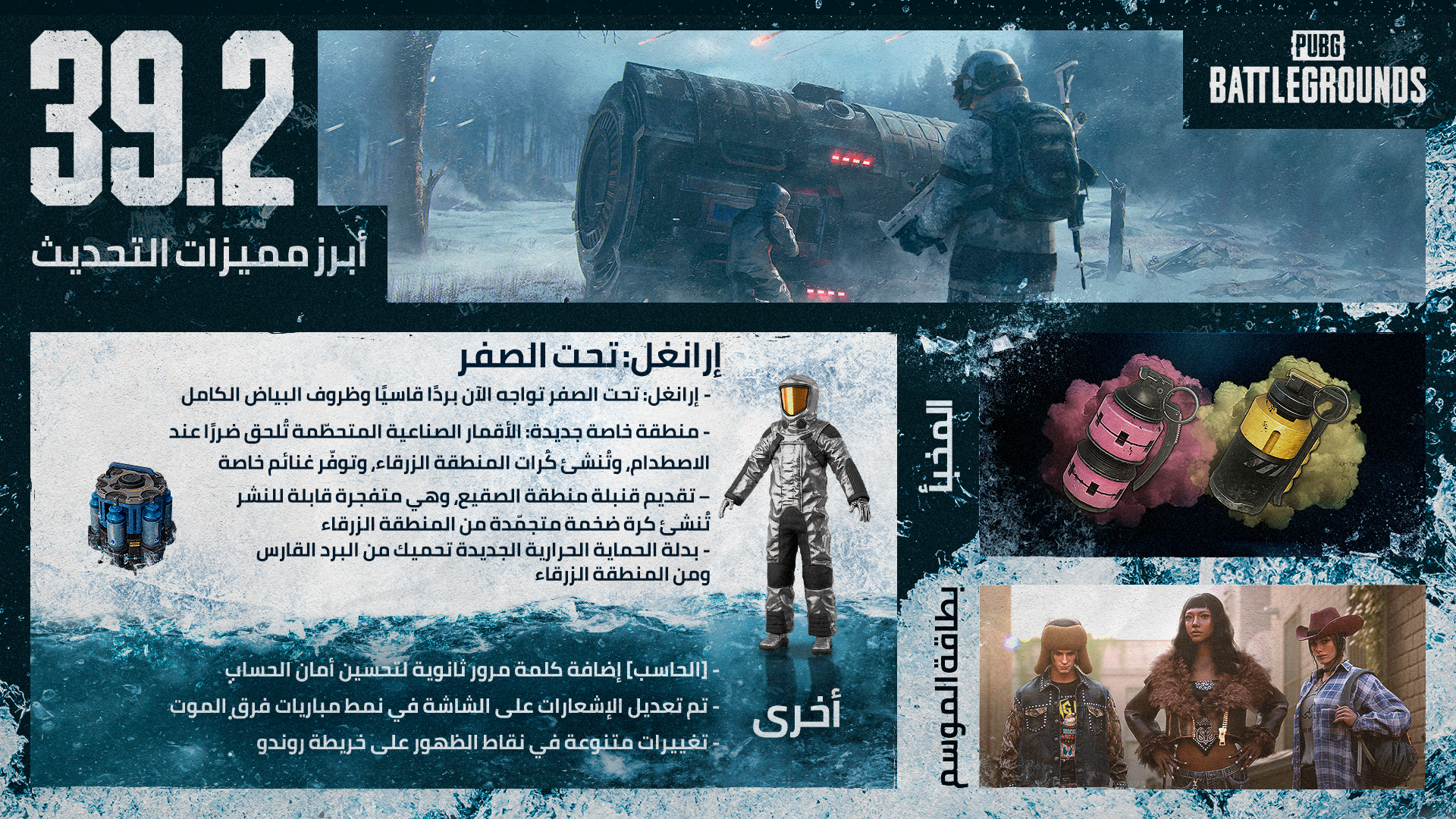 تعليقات فريق التطوير: في التحديث 39.2، نُقدّم نسخة أكثر قسوة من ذي قبل؛ إرانغل: المتجمّد. مع إضافة منطقة خاصة جديدة تتميز بسقوط الأقمار الصناعية، وقنبلة منطقة الصقيع، وبدلة الحماية الحرارية، قدمنا توسعًا لكل من التهديدات التي يواجهها اللاعبون والأدوات المتاحة لمواجهتها. تهدف هذه التغييرات المصحوبة بالطقس الديناميكي الأكثر قسوة، إلى زيادة حدّة التوتّر أثناء النجاة في البرد القارسٍ. من خلال هذا التحديث، نتمنى لكم الاستمتاع بالمعنى الحقيقي للنجاة في بيئة أشد قسوة.