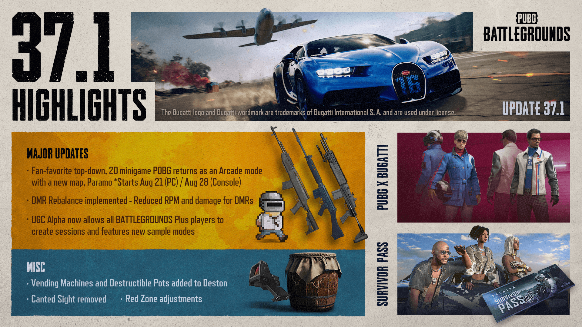 Wir halten euch mit spannenden Updates zu unserer Kollaboration mit Bugatti auf dem Laufenden! Lasst euch die kommende "PUBG x Bugatti"-Ankündigung nicht entgehen. Dort erfahrt ihr, wie ihr euch die exquisiten Bugatti-Skins sichern könnt, euch auf der nagelneuen Bugatti-Herstellungsseite in der Werkstatt zurechtfindet und vieles mehr!