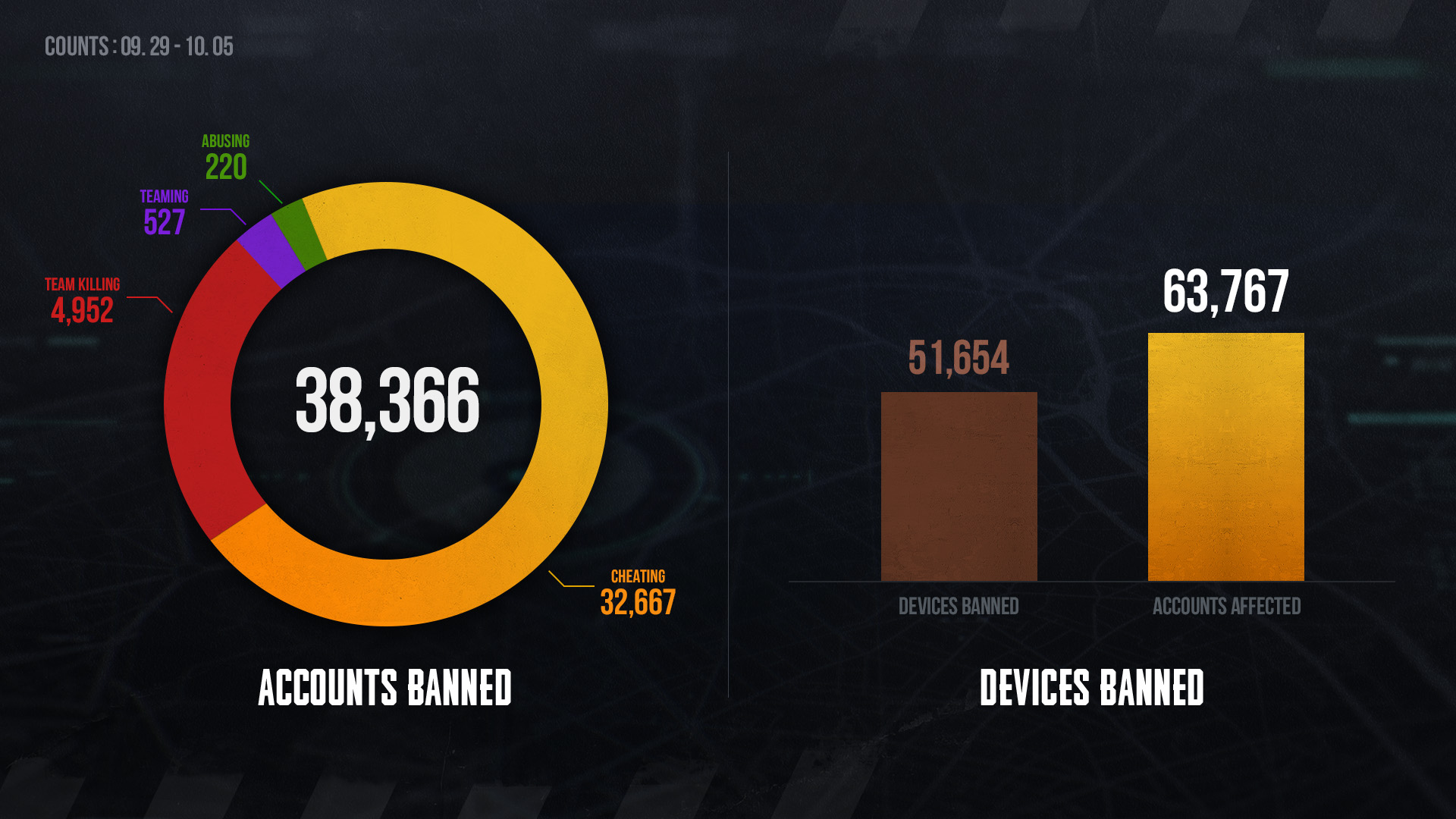 Wir teilen die Liste der gesperrten Spielerinnen und Spieler für 29.09 ~ 05.10, um das Bewusstsein für den Missbrauch mit illegaler Software und die Konsequenzen von Fehlverhalten zu erhöhen. Bitte schaut euch die Liste der Personen an, die wegen Verstößen gegen die Verhaltensregeln gesperrt wurden.