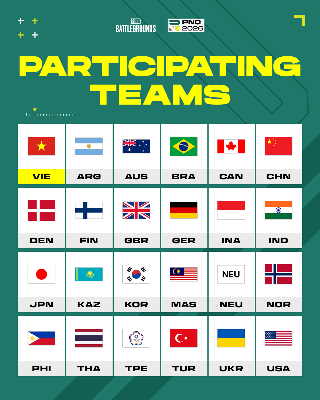24 teams will once again battle across five days of intense competition. With new challenger teams joining the fray, this year's PNC will feature the most diverse lineup in the tournament's history. Get ready for the ultimate all-star showdown in PUBG Esports — PUBG Nations Cup 2026!