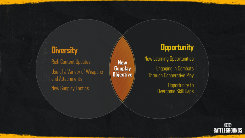 L’un des nouveaux objectifs du gunplay de PUBG: BATTLEGROUNDS est de promouvoir la communication avec les joueurs dans ce domaine bien précis et de les informer en conséquence. Nous pensons que la communication active est nécessaire plus que jamais pour optimiser l’expérience qu’offre le gunplay avec le nouveau thème de la diversité et de l’opportunité.