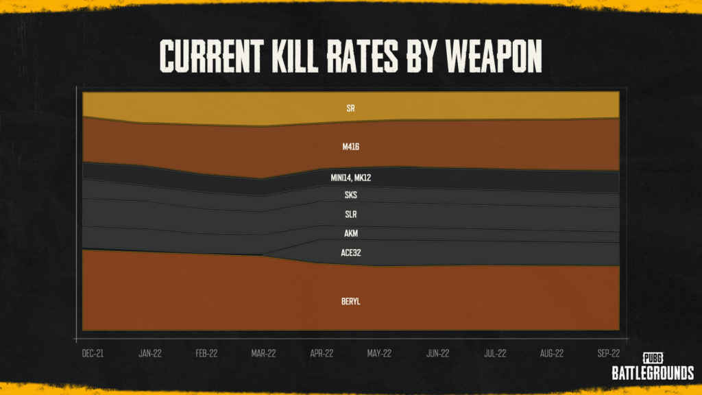 Un exemple typique ? Les guns de 5,56 mm qui ont eu droit à un petit coup de fouet en 2022 ! À noter également que nous avons implémenté le rollback du M416, comme la communauté le demandait depuis un certain temps. En commençant par le Mk12, les stats des DMR de 5,56 mm ont reçu une augmentation importante pour que les armes de ce calibre puissent tenir la dragée haute à leurs homologues de 7,62 mm. Par conséquent, l’utilisation et le ratio de victoire actuels des guns de 5,56 mm ont connu une hausse, comparés au début 2022. De plus, bien qu’il n’y ait pas une différence flagrante, on constate une augmentation de l’utilisation d’autres armes qui, jusqu’à présent, étaient relativement peu prisées. En ce moment, nous nous concentrons sur les armes principales les plus usitées, mais nous prévoyons d’apporter ces améliorations à d’autres guns qui ne font généralement pas l’unanimité, tels que les SMG, les fusils à pompe et les pistolets.