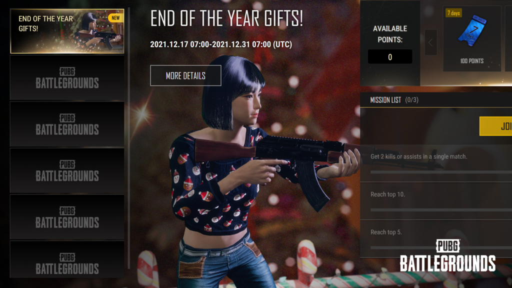 | Date (PC et Console) | PST : 14 décembre à 23 h – 27 décembre à 15 h 59CET : 15 décembre à 8 h – 28 décembre à 0 h 59KST: 15 décembre à 16 h – 28 décembre à 8 h 59 | PST : 17 décembre à 16 h – 19 décembre à 15 h 59CET : 18 décembre à 1 h – 20 décembre à 0 h 59KST: 18 décembre à 9 h – 20 décembre à 8 h 59 | PST : 24 décembre à 16 h – 26 décembre à 15 h 59CET : 25 décembre à 1 h – 27 décembre à 0 h 59KST: 25 décembre à 9 h – 27 décembre à 8 h 59 |