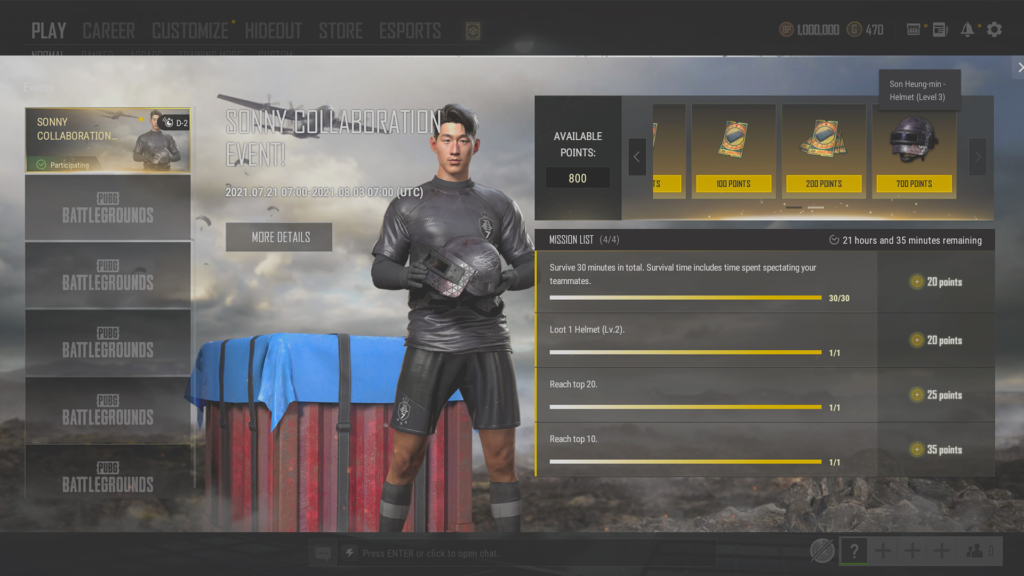 L’événement collaboratif entre Son Heung-min et PUBG ! Amusez-vous bien et n’oubliez pas de consulter la page des événements pendant que nous préparons nos prochaines festivités !