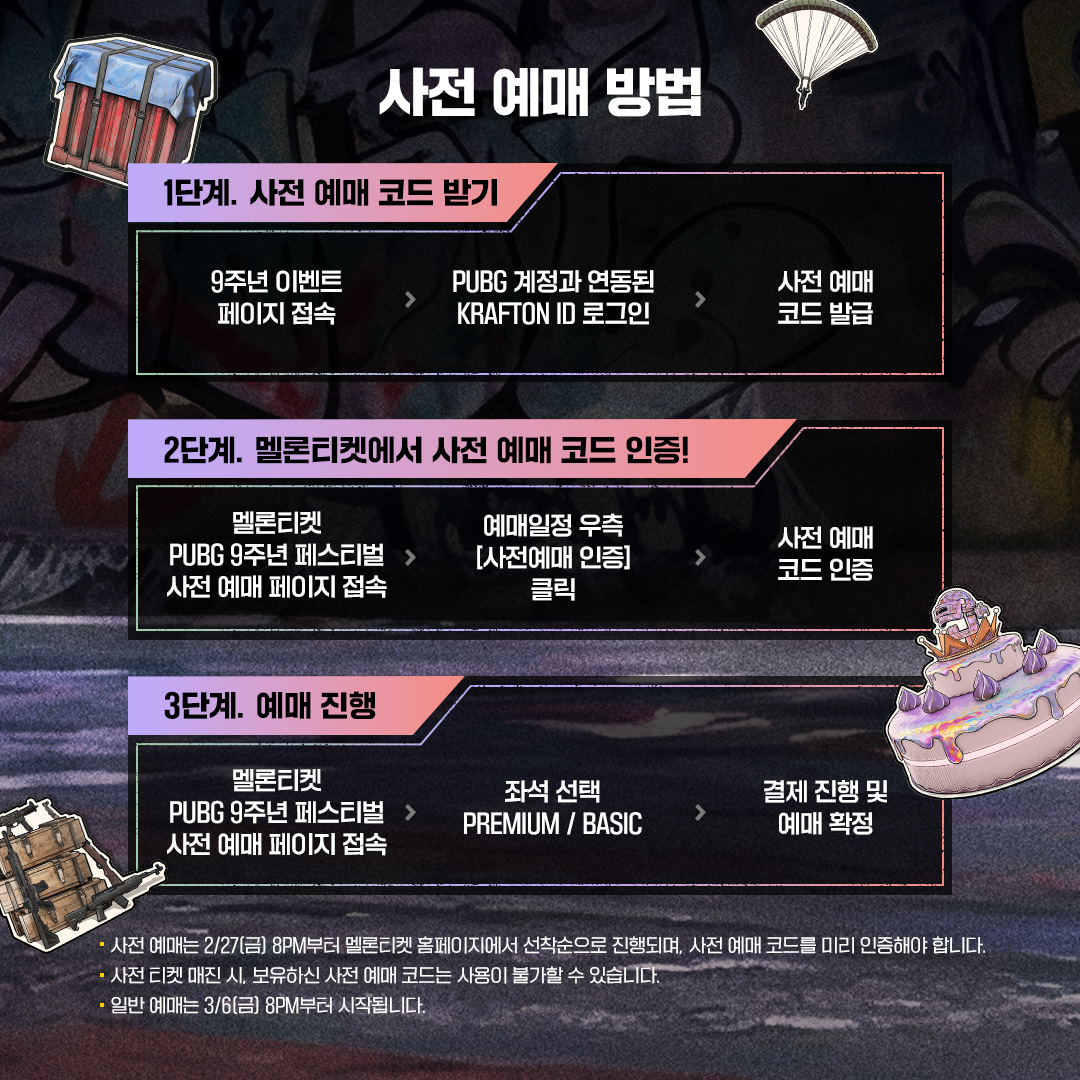 2026 PUBG 9주년 페스티벌에 참여하기 위해서는 티켓을 예매해야 합니다. 상세한 예매 방법을 아래에서 확인 부탁드립니다.