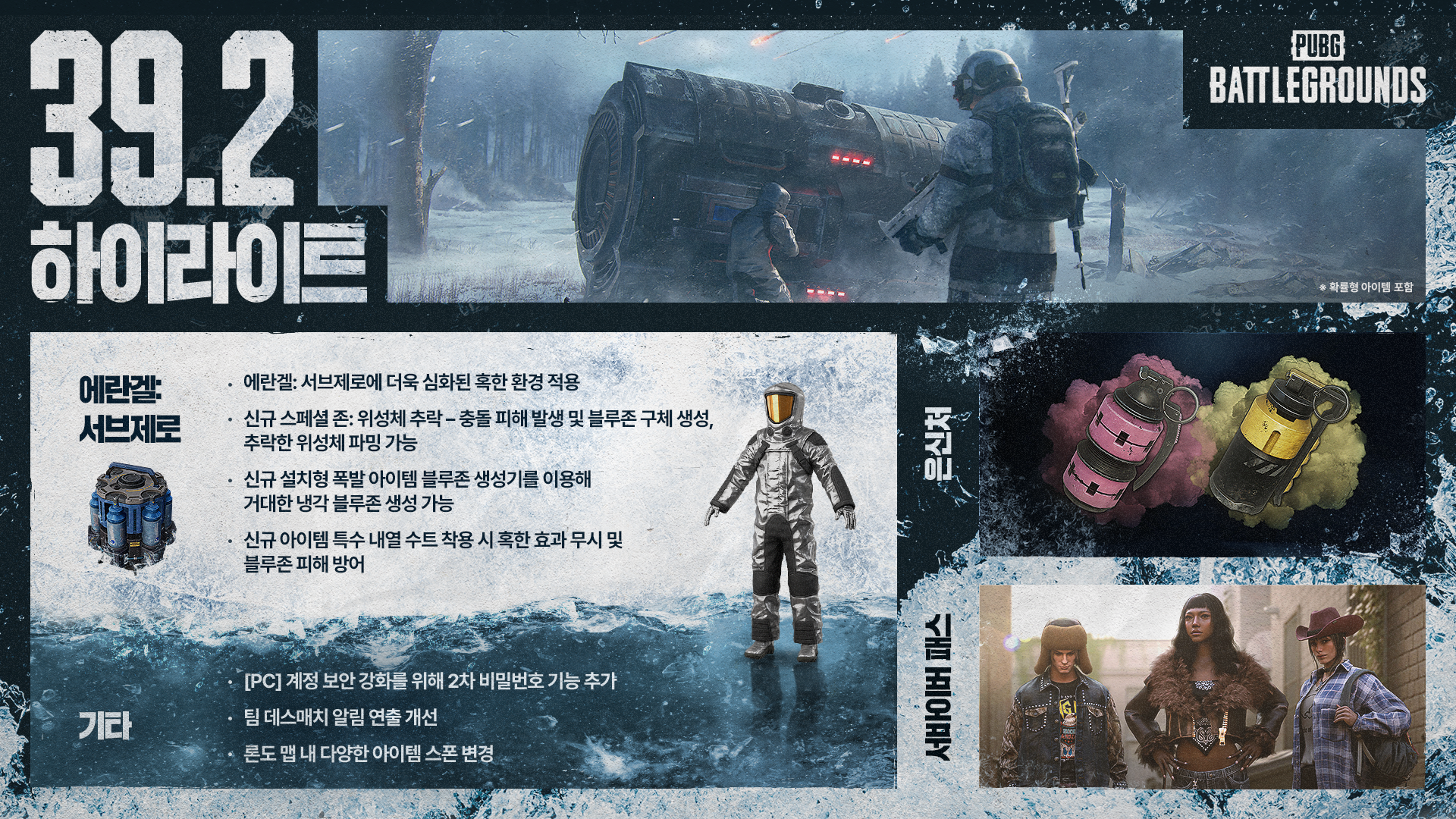 개발자 코멘트: 업데이트 39.2에서는 더욱 심화된 혹한 속의 에란겔: 서브제로를 선보입니다. 위성체 추락이라는 새로운 스페셜 존과 블루존 생성기, 특수 내열 수트를 통해 전장의 위협과 대응 수단을 함께 확장했으며, 한층 매서워진 동적 날씨 변화를 통해 혹한의 긴장감을 보다 깊이 있게 경험하실 수 있도록 했습니다. 이번 업데이트를 통해 더욱 가혹해진 환경 속에서 진정한 생존의 의미를 경험해 보시길 바랍니다.
