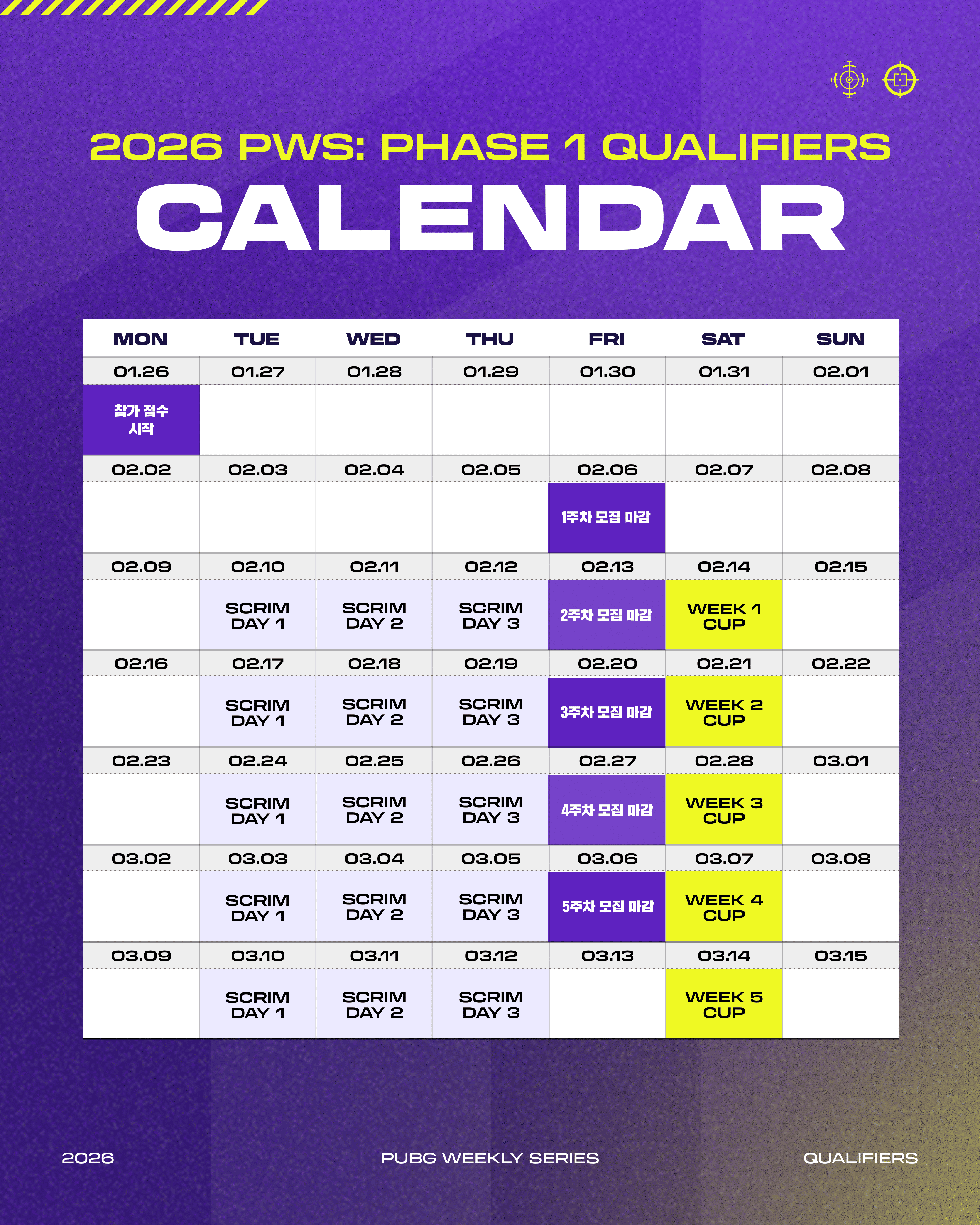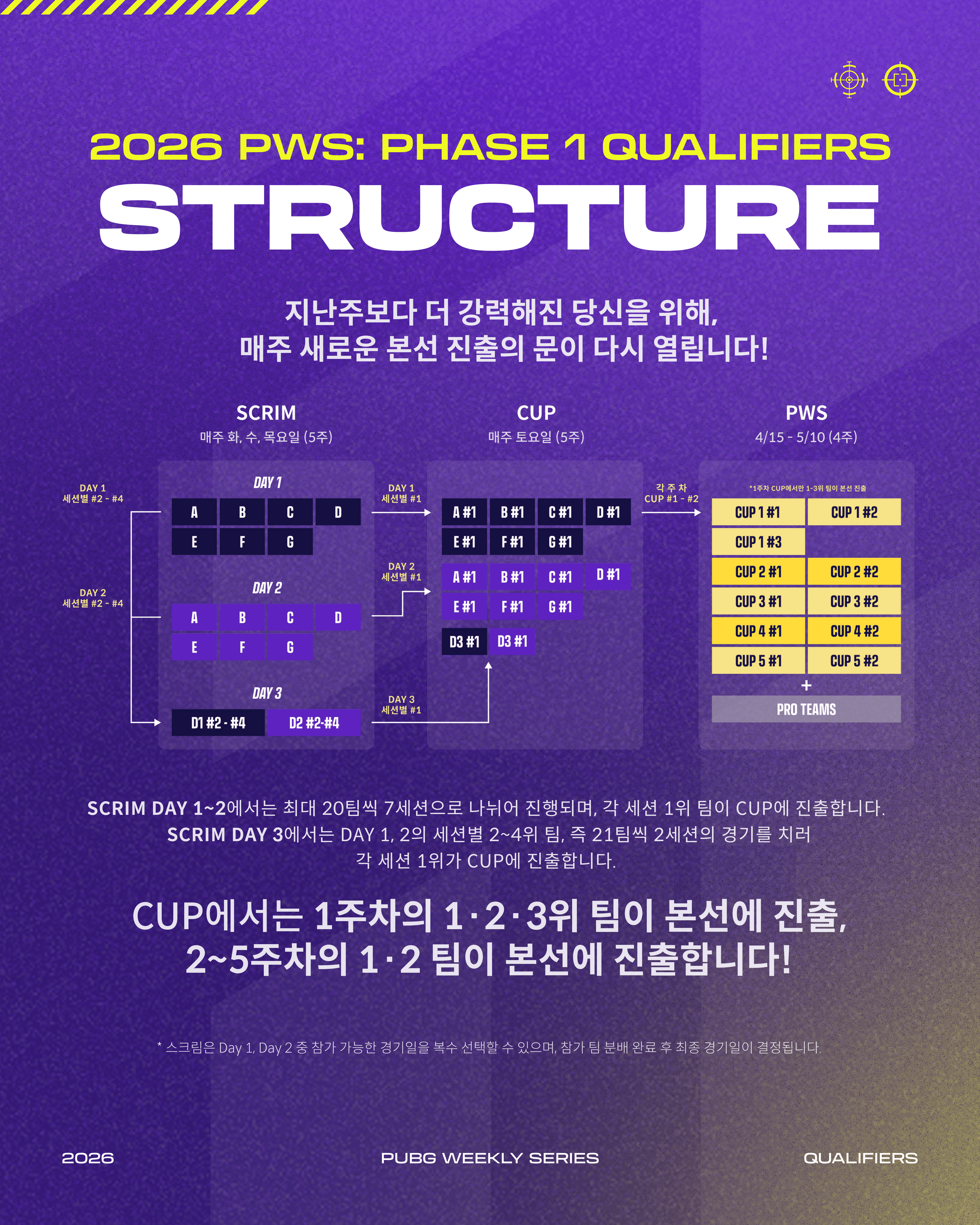 2026 PWS: Phase 1 예선은 Scrim과 Cup으로 나누어지며, 2월 10일(화)부터 매주 화, 수, 목은 Scrim이 진행되고 2월 14일(토)부터 매주 토요일은 Cup이 5주간 진행됩니다.