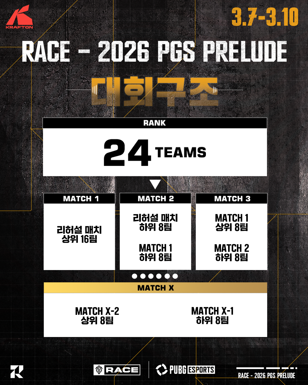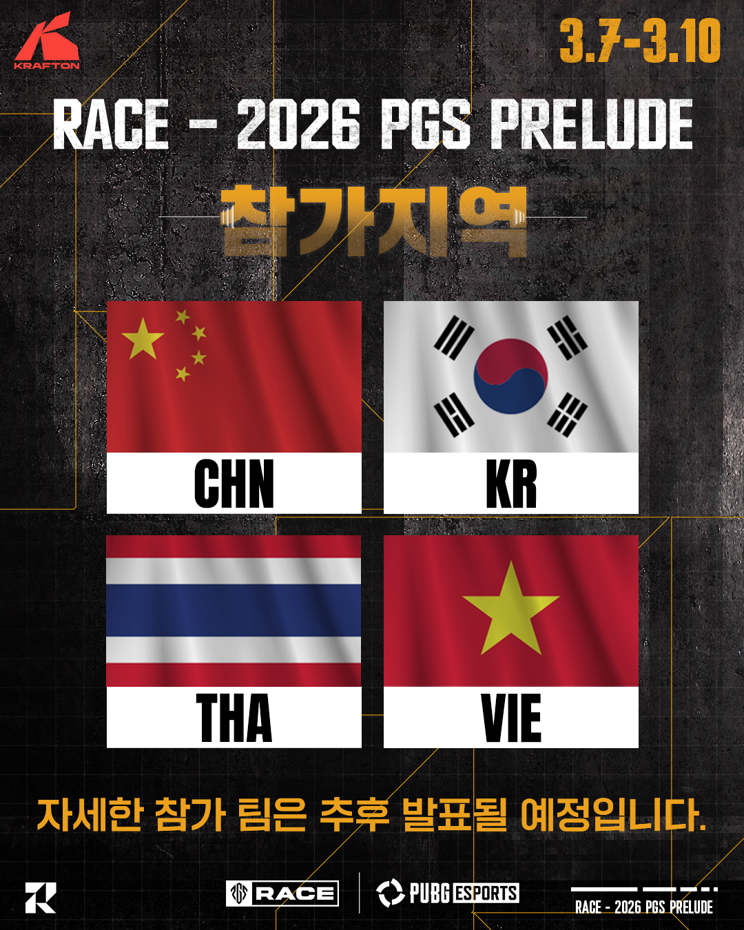 2026 RACE - PGS PRELUDE에는 한국, 중국, 태국, 베트남 4개국의 24개 팀이 참가하며 자세한 참가 팀은 추후 발표됩니다.
