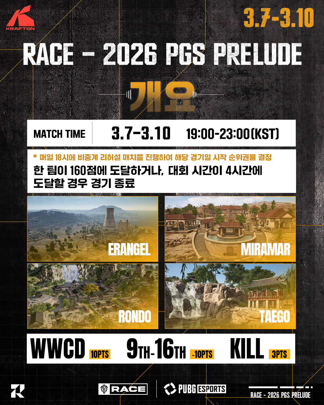 본 대회는 레이스 방식으로 진행되며, 한 팀이 160점에 도달하면 해당 경기 일의 경기가 종료됩니다. 단, 하루 최대 진행 시간은 4시간입니다.
