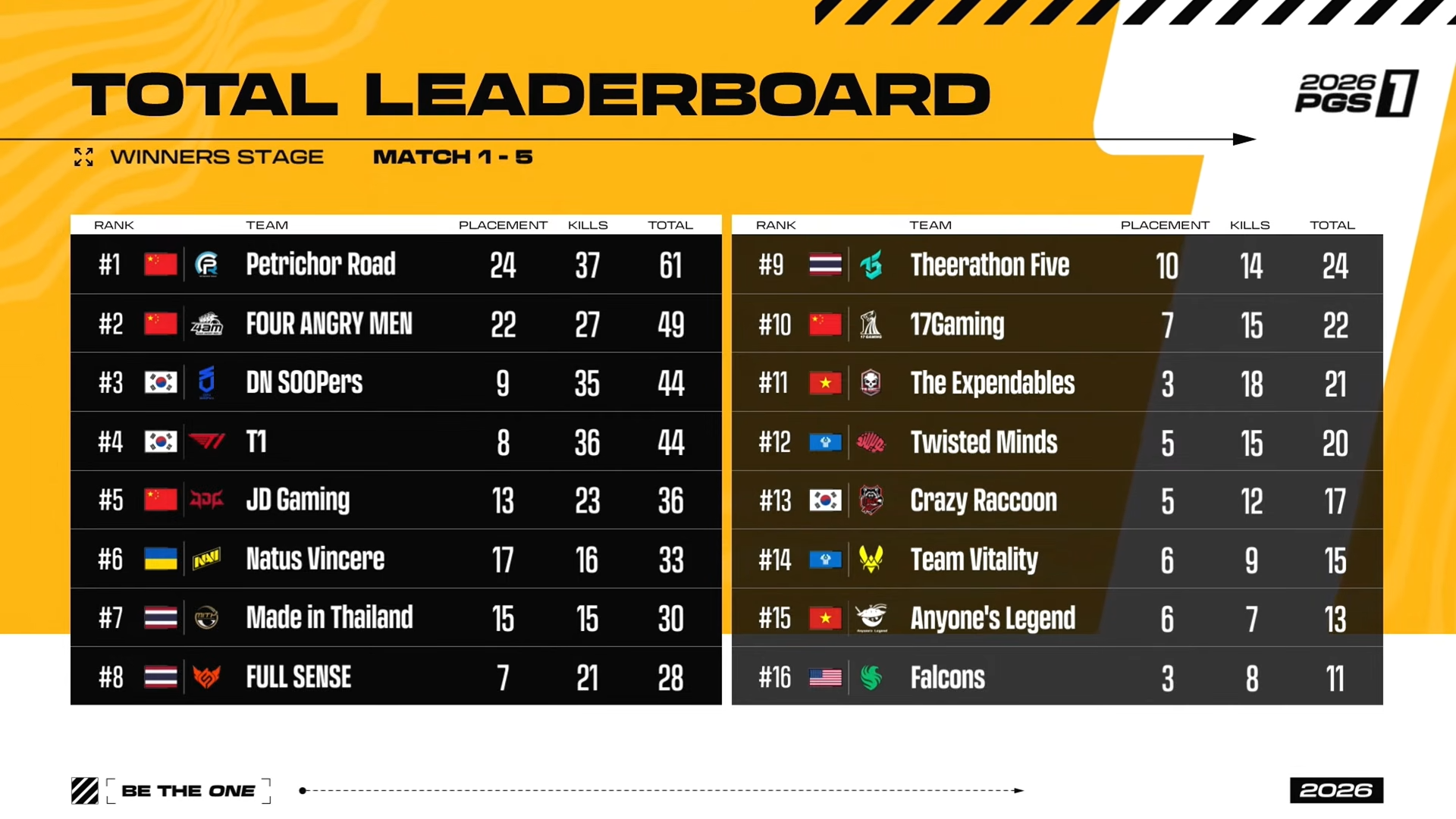 Petrichor Road와 FOUR ANGRY MEN이 95포인트 동률로 마감했으며, 타이브레이커를 통해 Petrichor Road가 PGS 1 정상에 올랐습니다. Made in Thailand는 파이널 스테이지 최다 킬(67킬)을 기록하며 3위를 확보했습니다. Petrichor Road의 위너스 스테이지 1위 어드밴티지 포인트(10점)가 최종 순위를 가른 결정적 요소가 되면서, 새롭게 도입된 어드밴티지 포인트 시스템의 영향력을 확인할 수 있었습니다.