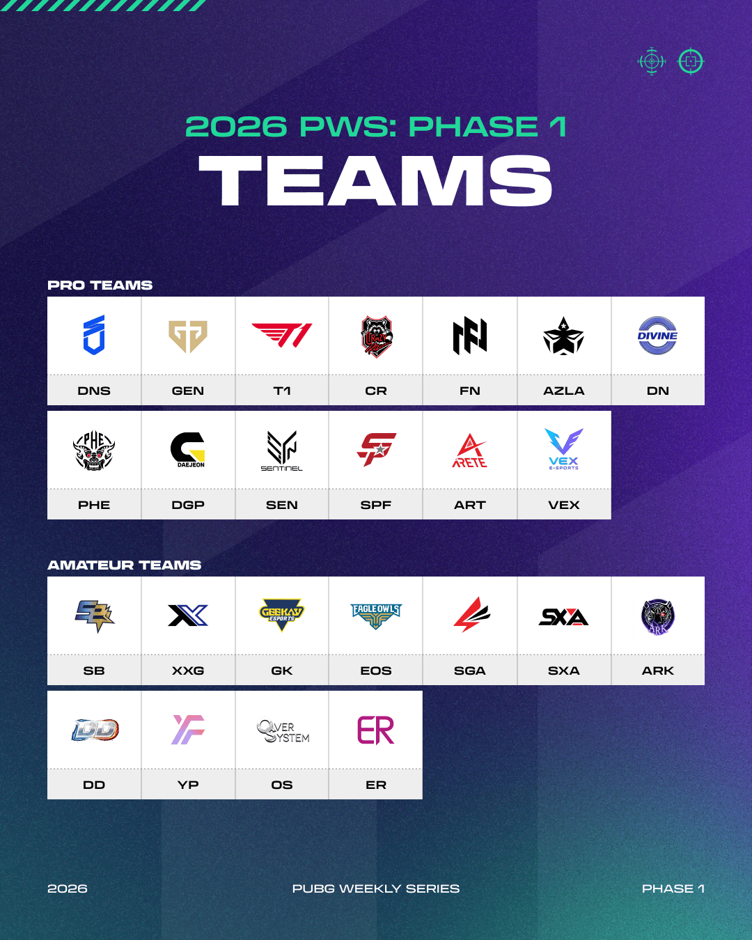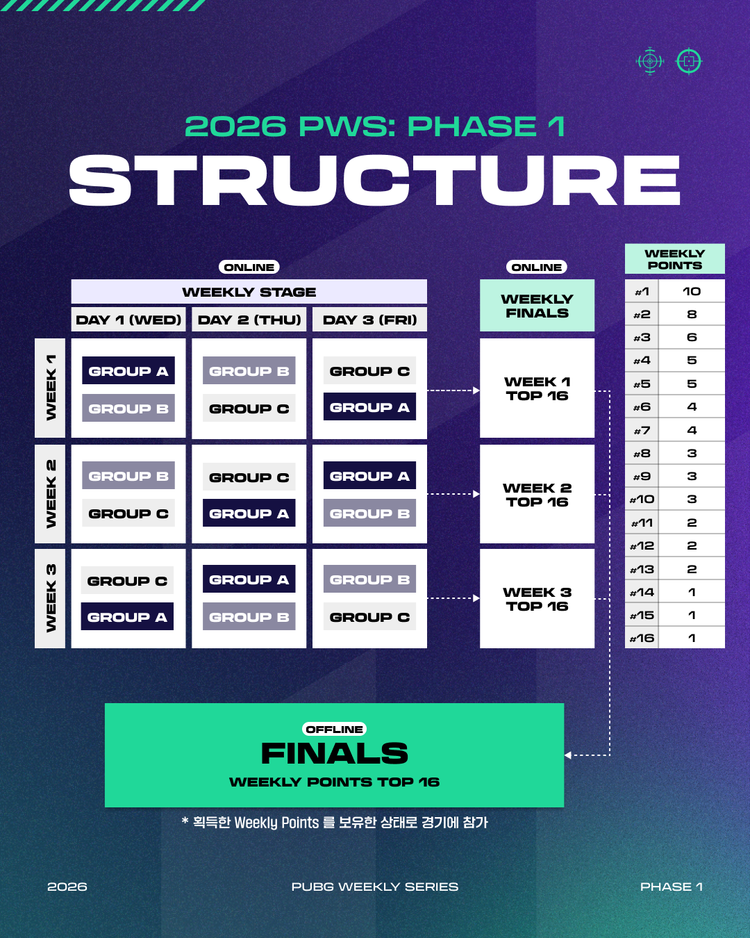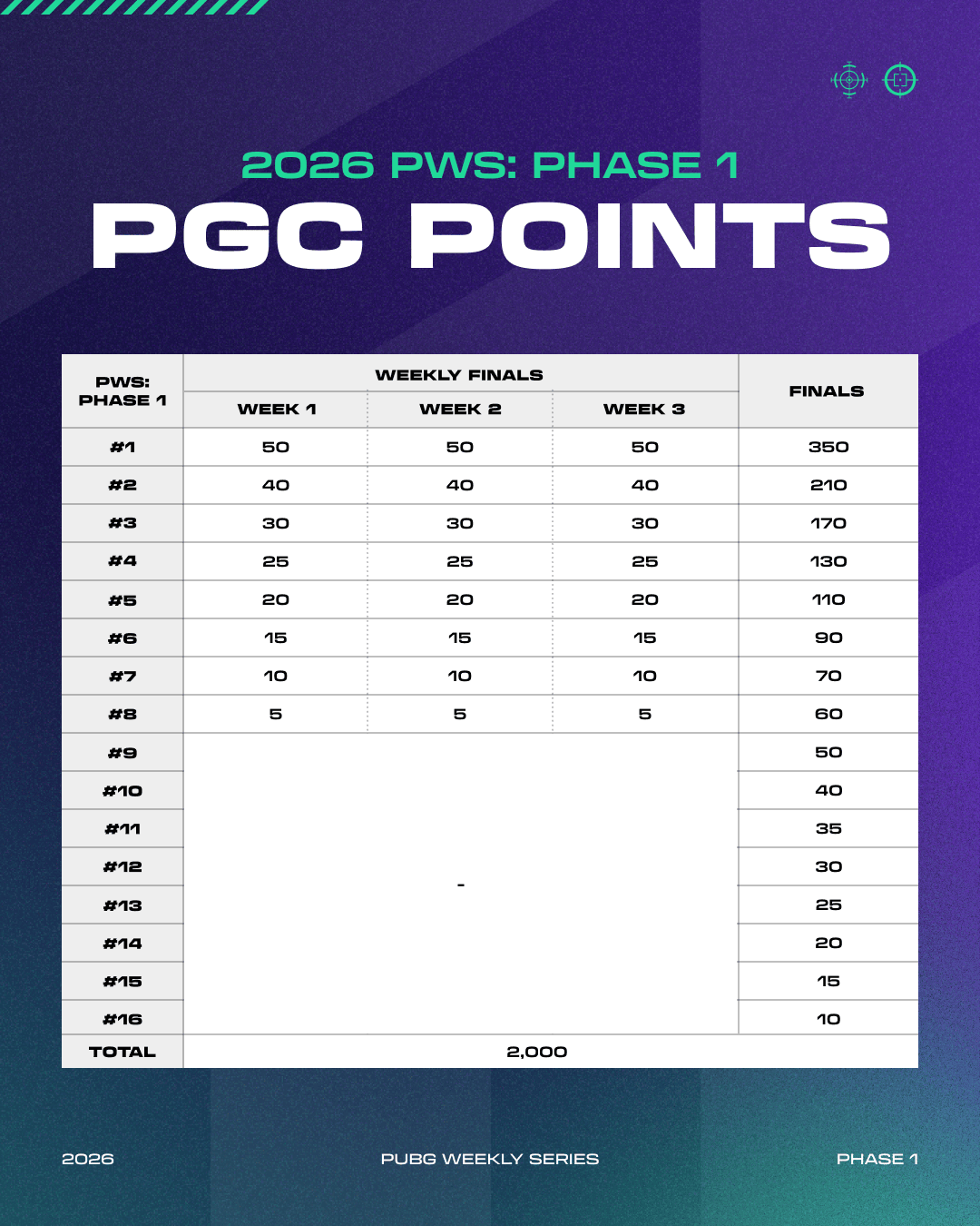 - 2026 PWS: PHASE 1 경기를 통해 획득한 KR PGC Points 상위 2 개 팀은 PUBG Global Series 7 – 12 (하반기) 대회 참가 자격을 획득