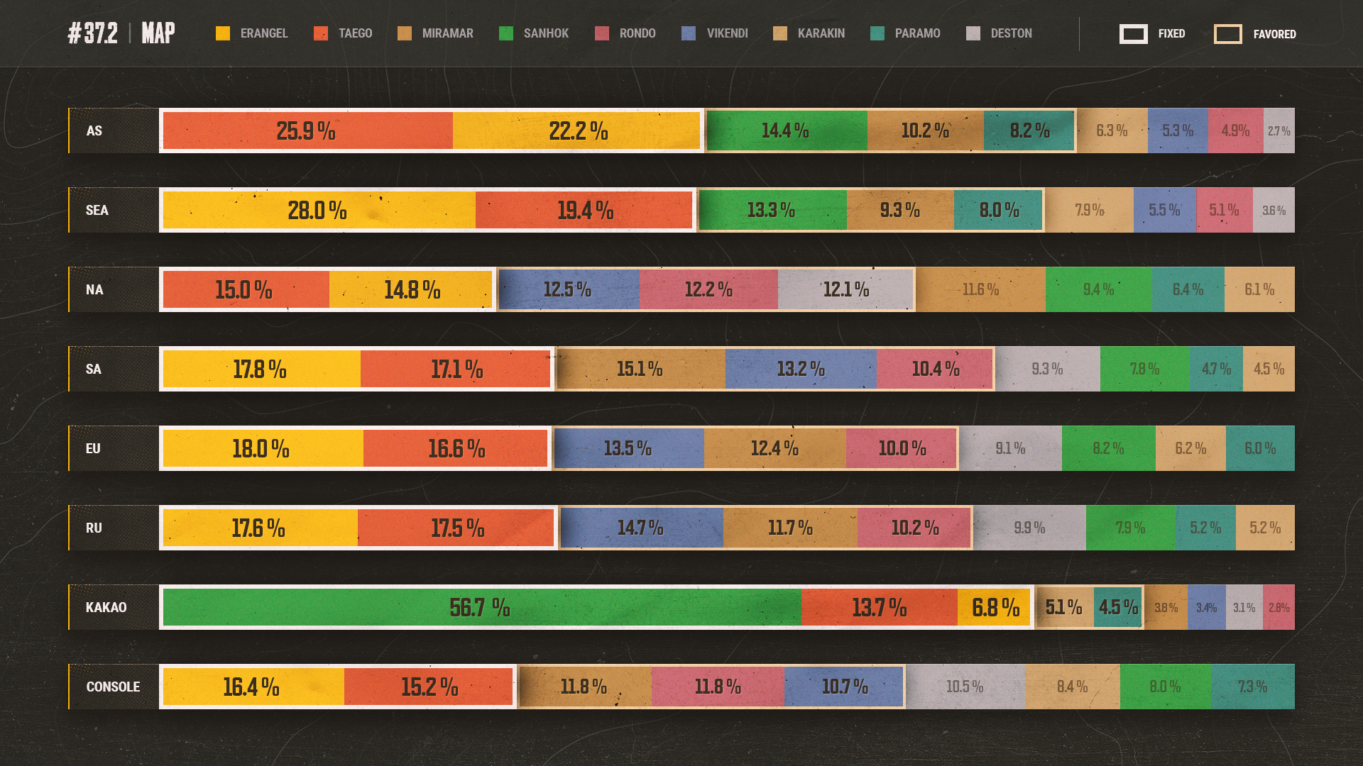 Erangel (25%) / Miramar (25%) / Taego (25%) / Rondo (25%)