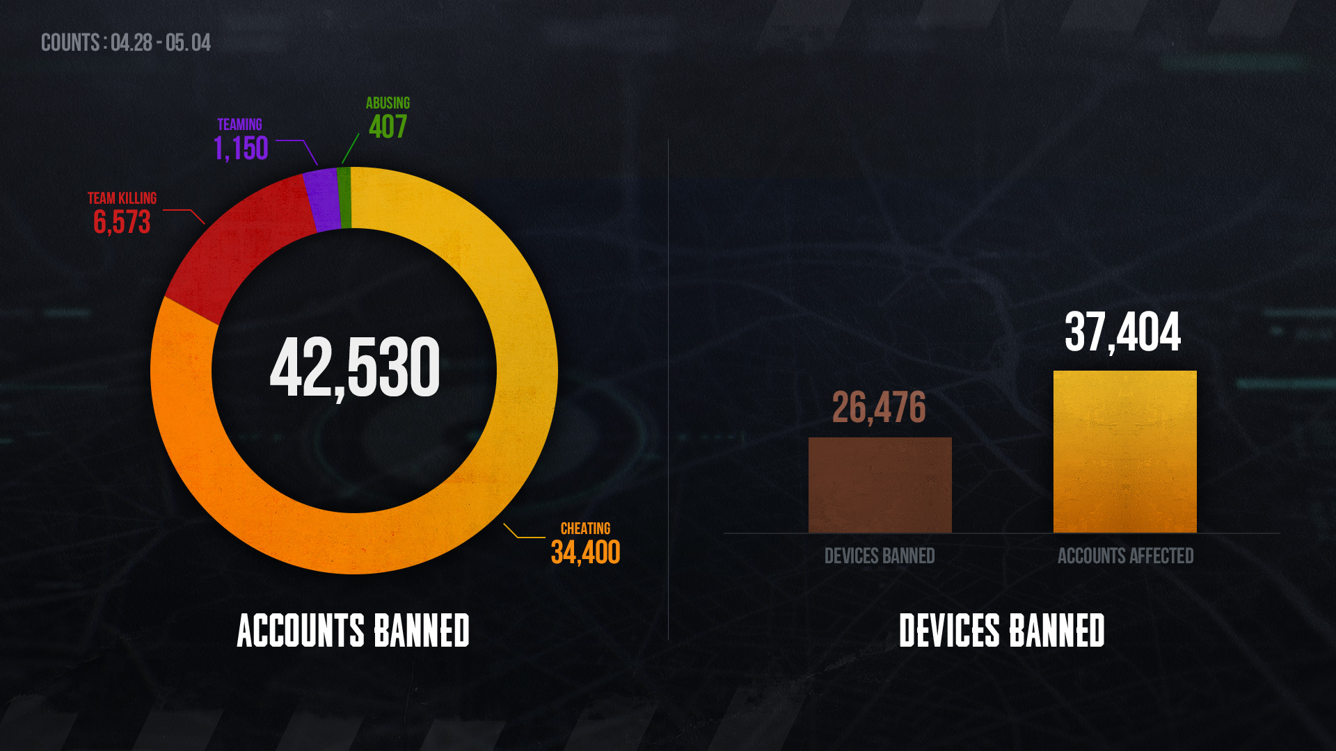 Ниже мы опубликовали список заблокированных игроков на период с 28.04 до 04.05, чтобы повысить осведомленность о злоупотреблении нелегальным программным обеспечением и о последствиях неправомерных действий в игре. Пожалуйста, ознакомьтесь со списком игроков, которые были заблокированы за нарушение правил поведения.