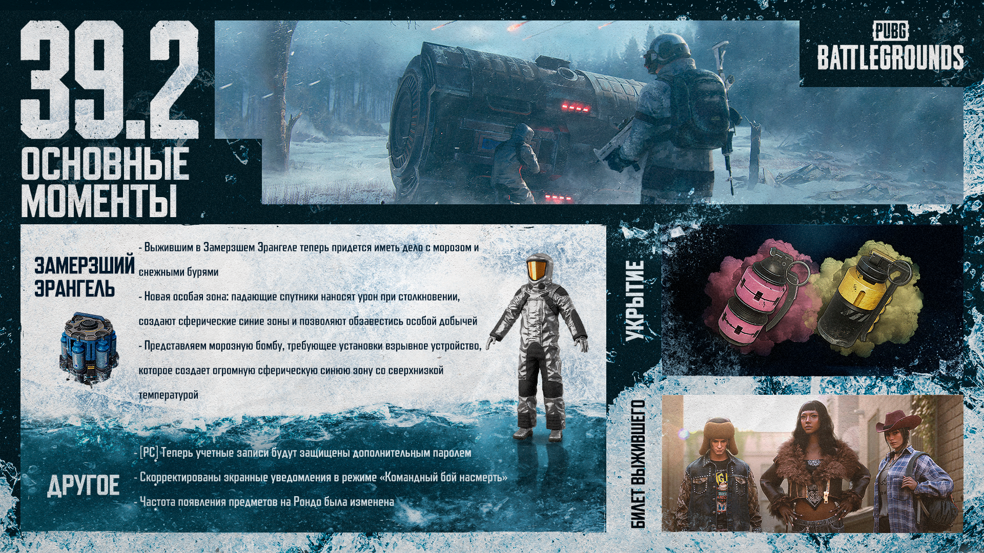 Комментарий разработчиков: В обновлении 39.2 мы добавили в игру еще более экстремальную версию Эрангеля: Subzero. Помимо новой особой зоны с упавшими спутниками в игре появилась морозная бомба и костюм тепловой защиты, то есть новая угроза для игроков и возможность ей противостоять. В сочетании с динамической погодой эти изменения сделают азарт выживания в холодном климате еще более захватывающим. Мы надеемся, что благодаря этому дополнению вы как следует прочувствуете все опасности пребывания в условиях по-настоящему беспощадной зимы.