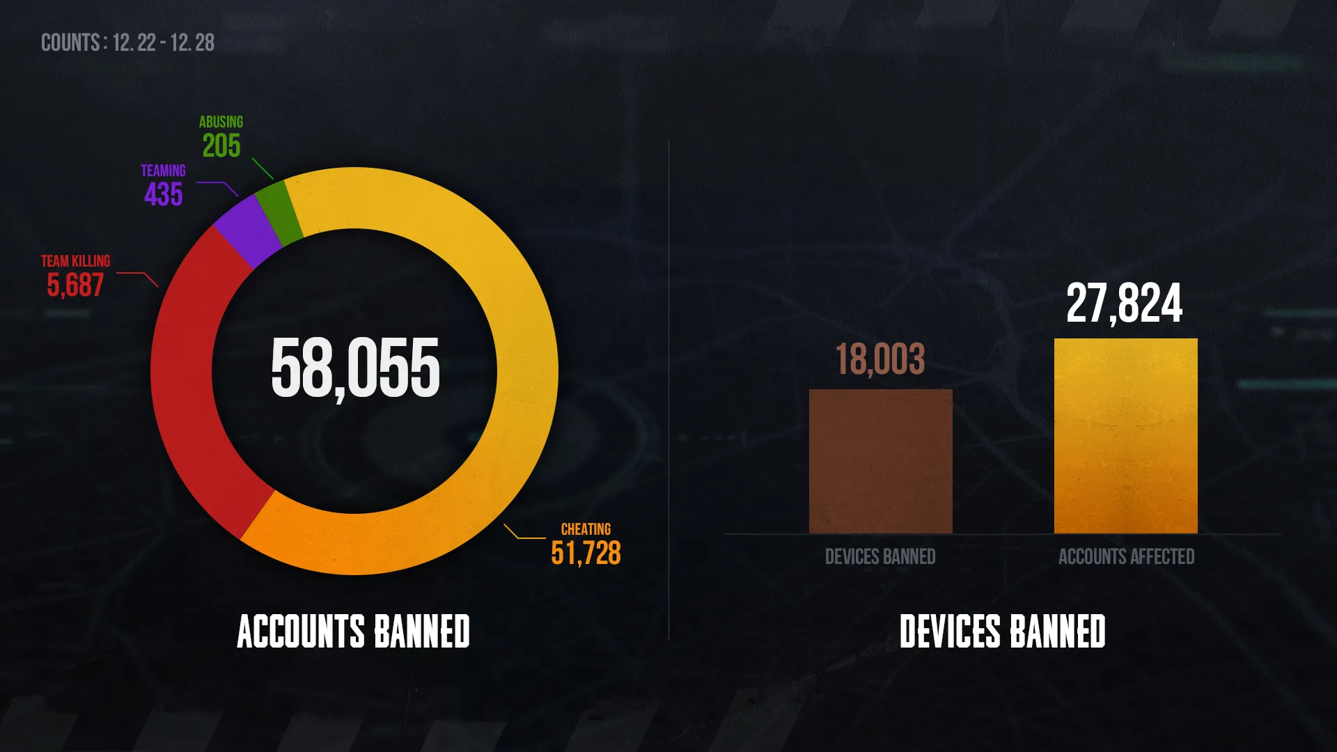 Yasa dışı yazılımları suistimal etmenin ve uygunsuz hareketlerin sonuçları hakkında farkındalık yaratmak için 12/22~12/28 tarihleri arasında oyundan men edilen oyuncuların listesini paylaşıyoruz. Lütfen davranış kurallarını ihlal ettikleri için oyundan uzaklaştırılan oyuncuların listesine göz atın.