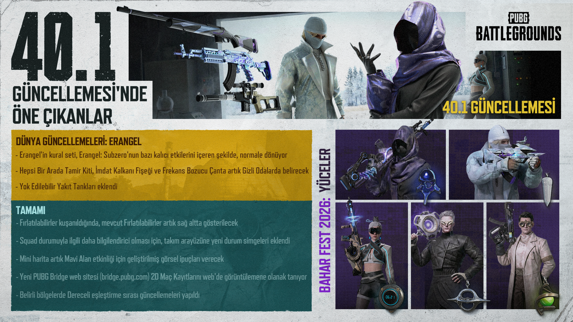 Geliştirici notu: 40.1 Güncellemesi ile birlikte, Erangel iki aylık anormal hava şartlarından sonra tanıdık biçimine geri dönüyor. Bu mevsimlik değişiklik sayesinde bir haritanın ortamındaki değişikliklerin çatışmaların akışına ve genel oynanış deneyimine nasıl etki edebileceğine dair değerli içgörüler elde etmiş olduk. Gelecek zamanlarda daha eğlenceli ve çeşitli içerikler sunmak için oyuncu geri bildirimlerinden faydalanmaya devam edeceğiz.