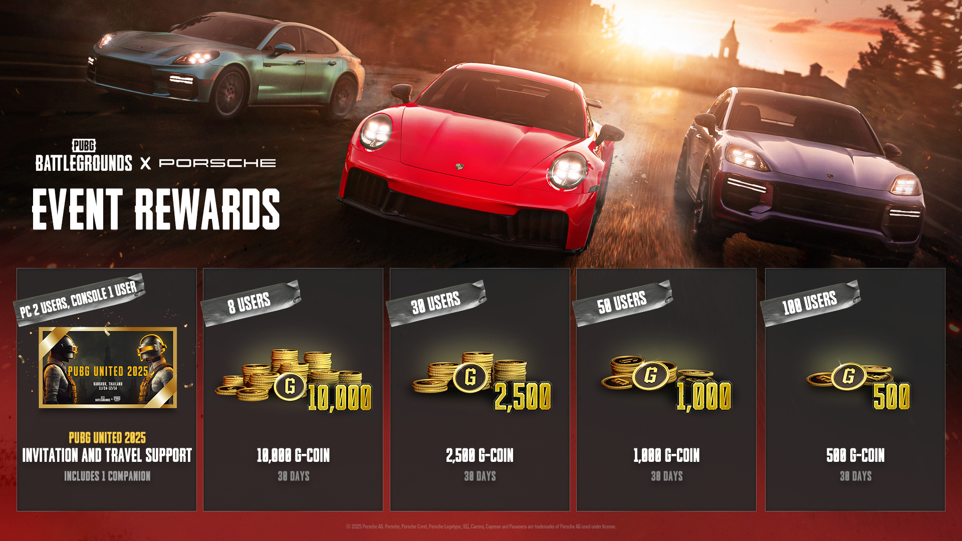 Cảm ơn bạn đã nhiệt tình tham gia Sự kiện web PUBG x Porsche! Sau khi thông qua quá trình Rút Thăm May Mắn, chúng tôi rất vui mừng được công bố tên của 191 người chơi may mắn sẽ nhận được phần thưởng ở bên dưới.