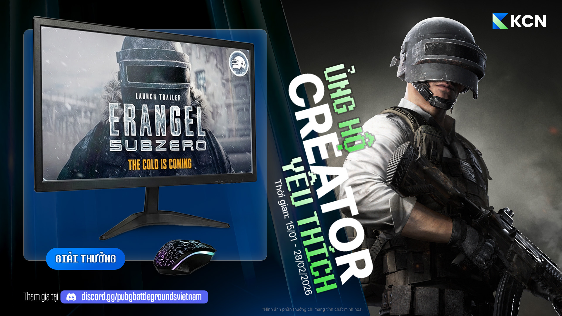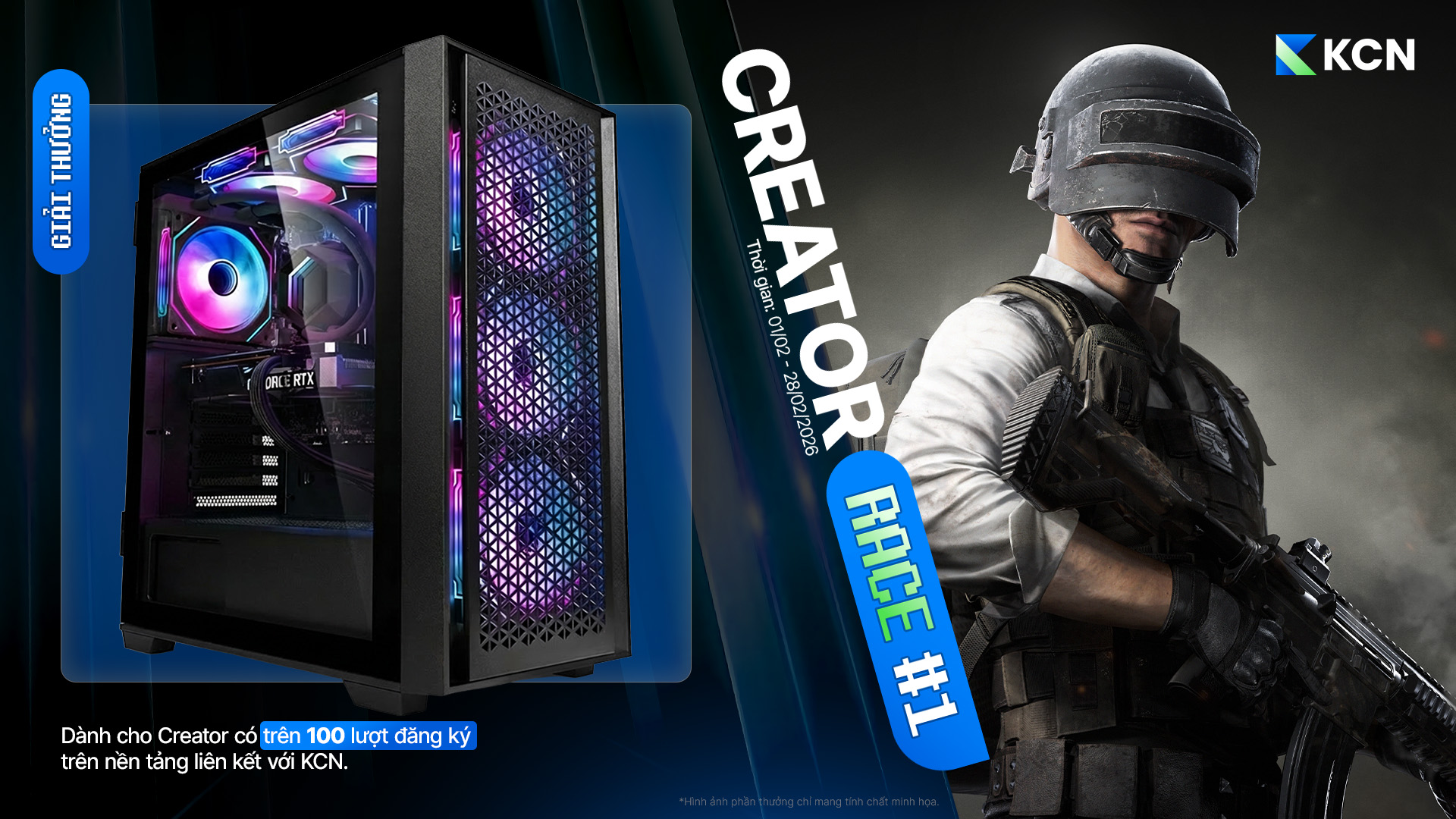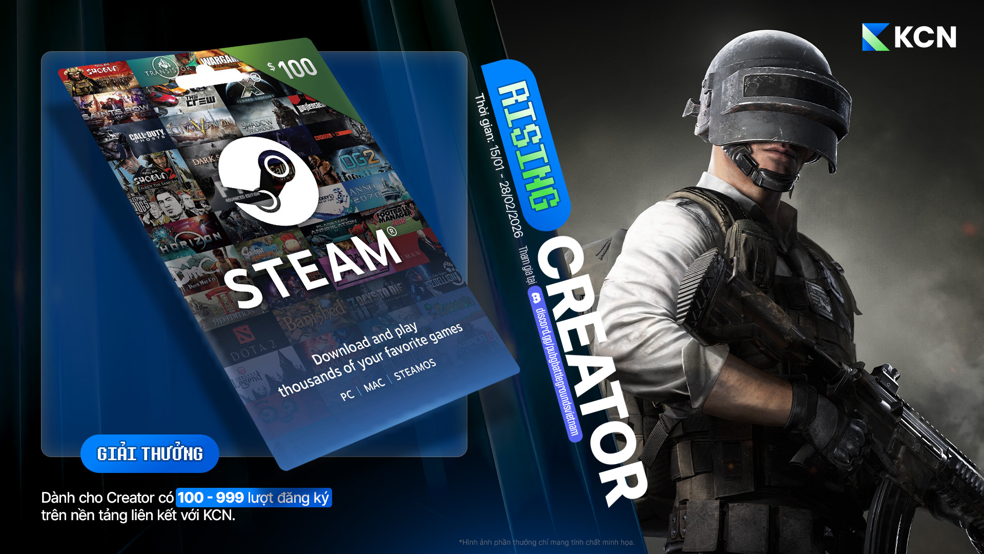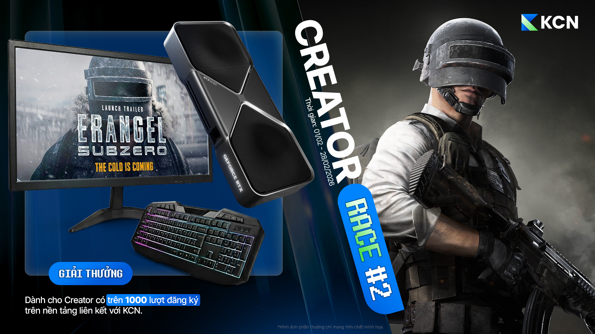 Nhằm chào mừng KRAFTON Creator Network (KCN) chính thức ra mắt tại Việt Nam, PUBG: BATTLEGROUNDS mang đến chuỗi sự kiện dành riêng cho cộng đồng Creator và người chơi PUBG Việt Nam, với nhiều phần thưởng giá trị như Card màn hình RTX 5090, Case máy tính custom với cấu hình cao cấp, màn hình Gaming cao cấp, chuột Gaming cao cấp, bàn phím Gaming cao cấp, cùng Steam Gift Card trị giá 100 USD.