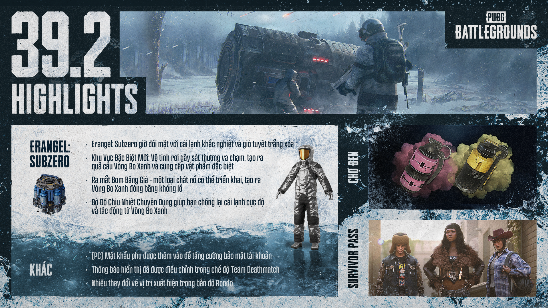 Nhận xét của nhà phát triển: Trong Bản cập nhật 39.2, chúng tôi sẽ cho ra mắt một phiên bản Erangel khắc nghiệt hơn: Subzero. Bằng việc bổ sung Khu vực đặc biệt mới với sự xuất hiện của Vệ tinh rơi, Bom Băng Giá và Bộ Đồ Chịu Nhiệt Chuyên Dụng, chúng tôi đã tăng thêm cả các mối đe dọa mà người chơi phải đối mặt lẫn các công cụ để khắc chế lại chúng. Kết hợp với thời tiết khắc nghiệt, những thay đổi này nhằm tăng thêm sự kịch tính khi phải sinh tồn giữa cái lạnh tàn khốc. Thông qua bản cập nhật này, chúng tôi hy vọng bạn sẽ trải nghiệm trọn vẹn cảm giác sinh tồn trong một môi trường còn tàn khốc hơn.