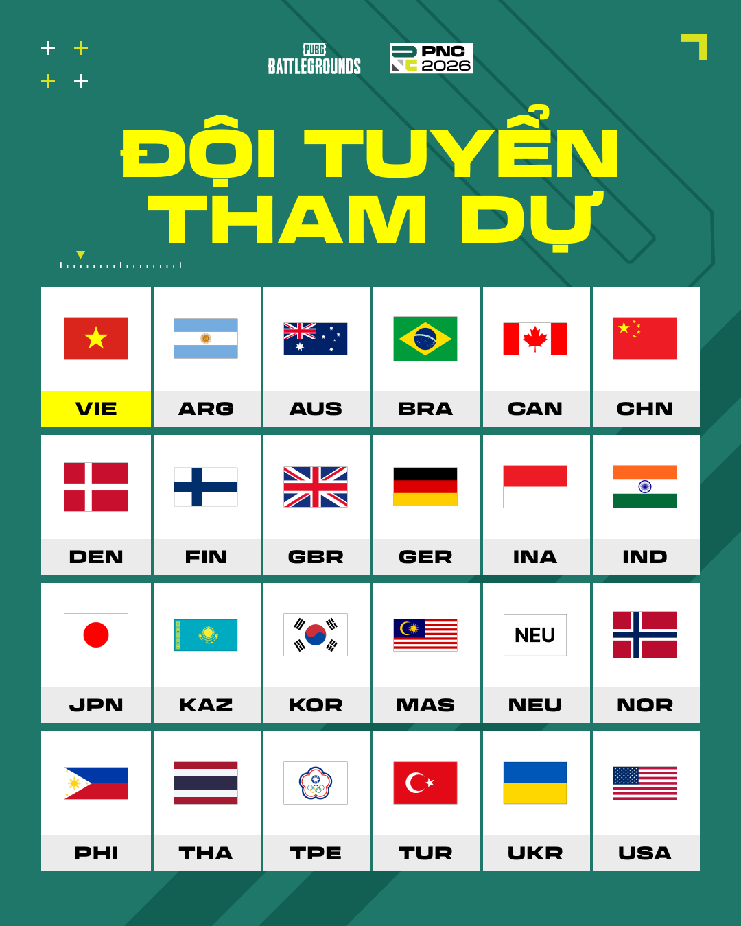 Thông tin chi tiết hơn về PNC 2026 — bao gồm đội hình các đội, mở bán vé và thông tin phát sóng — sẽ được công bố trên website chính thức của PUBG Esports trong những tuần tới. Chúng tôi rất mong được gặp bạn tại PUBG Nations Cup 2026!