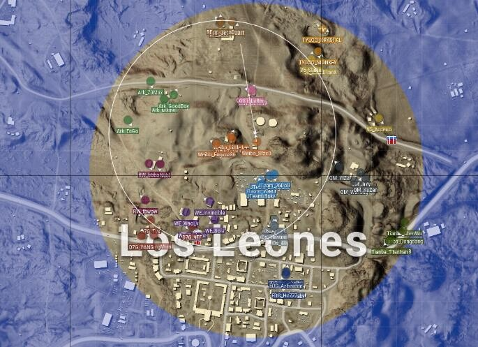 本局比赛采用沙漠图,飞机从西部飞往东南,航线与上局互相对称,仍然极端,WE去往狮城下方野区,RF选择电厂,QM选择狮城右侧野区,安全区刷在地图右侧,多支队伍都在圈内。
