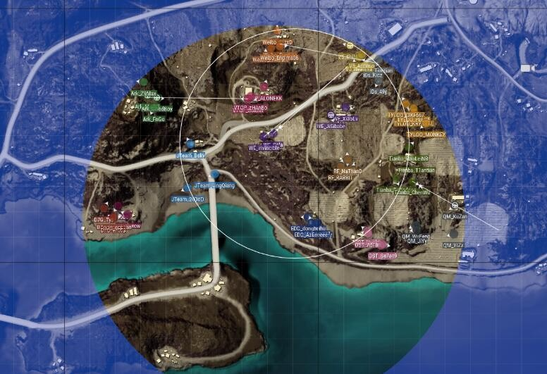 本局比赛采用海岛图,飞机从北部飞往东南,从S港左侧飞往N港,航线略偏右,OST选择了Y城,Jteam选择了防空洞,QM选择了R城,安全区刷在了地图右侧,以防空洞左侧为中心。