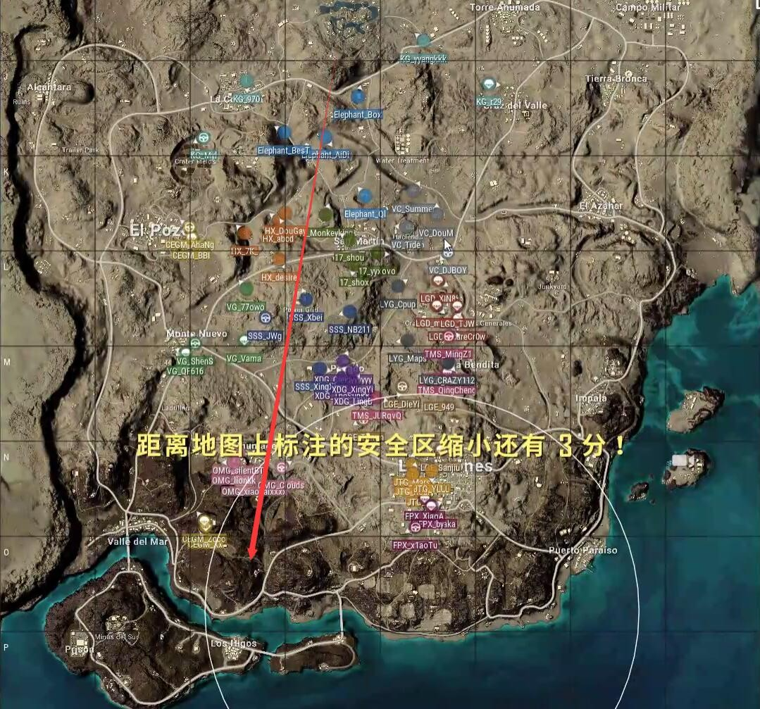本局比赛采用沙漠图,飞机从正北飞往正南,航线略偏左。各大队伍仍然选择了自己的固定跳点,安全区往下方刷新,但更显极端,只有OMG、JTG、FPX等少数队伍处于圈内。