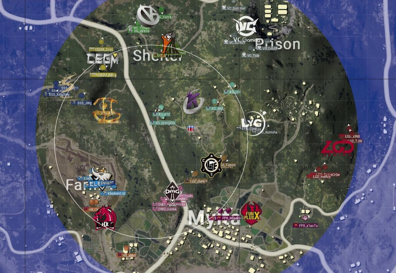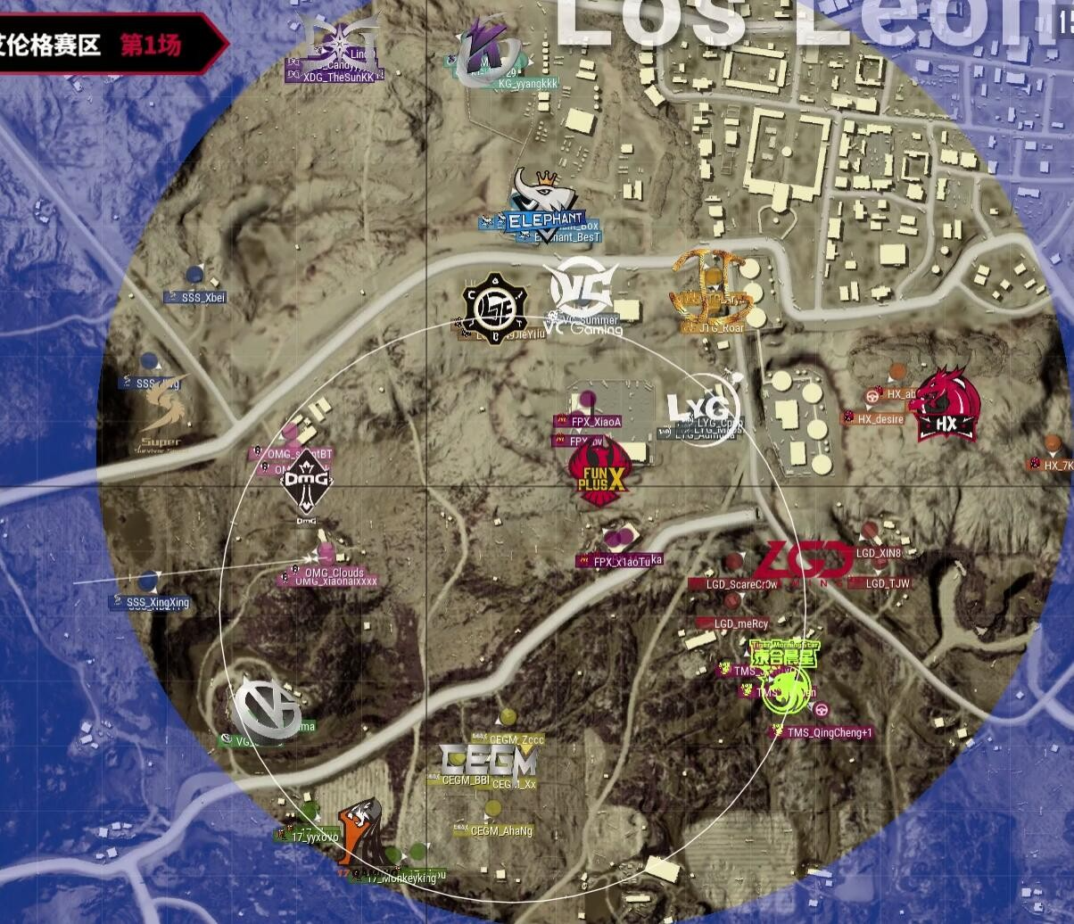 本局比赛采用海岛图,飞机从下往上,从N港飞往S城右侧,KG选择了农场,CEGM选择了G港,FPX选择了N港。安全区刷在了地图中上部分,以学校为中心。