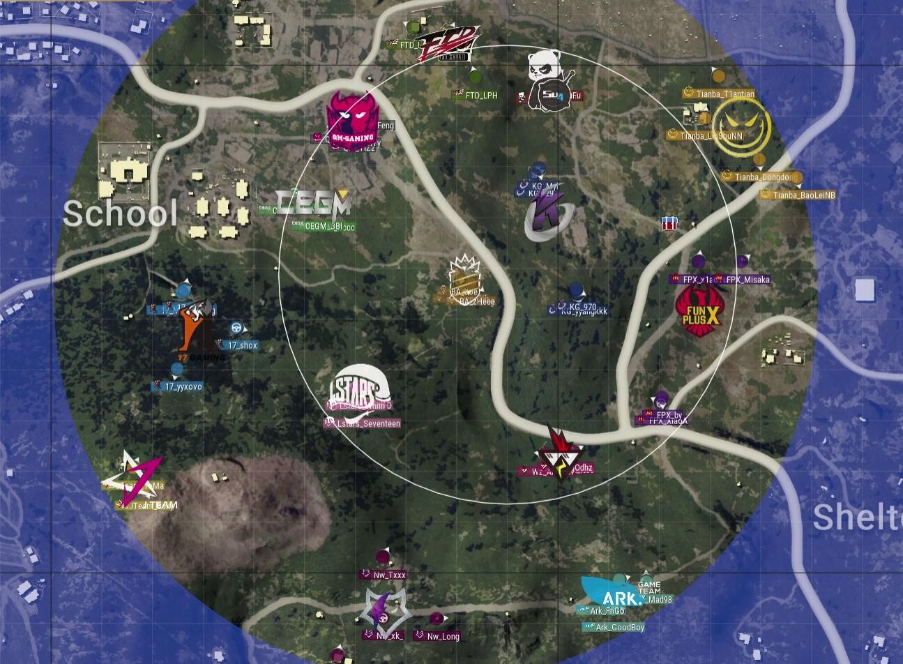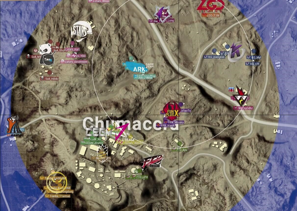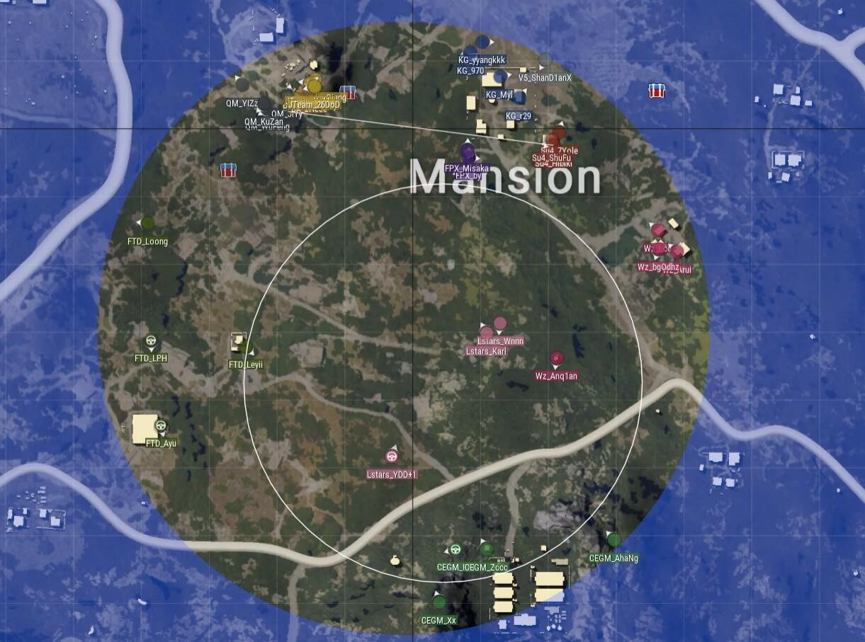 圈5下切,CEGM占据了圈边房区,Lstars占据了中心位置,而上方有多支队伍准备进圈。