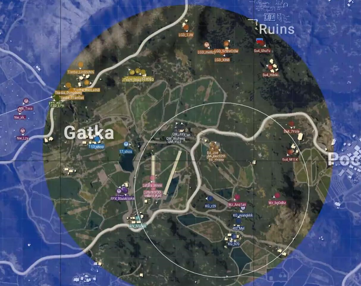本局比赛采用海岛图,飞机从左下飞往上方,航线偏左,CEGM选择了G港上城区,WZ选择了机场岛野区,Lstars选择了二狗家,安全区刷在了地图左上方,以龙脊山为中心。