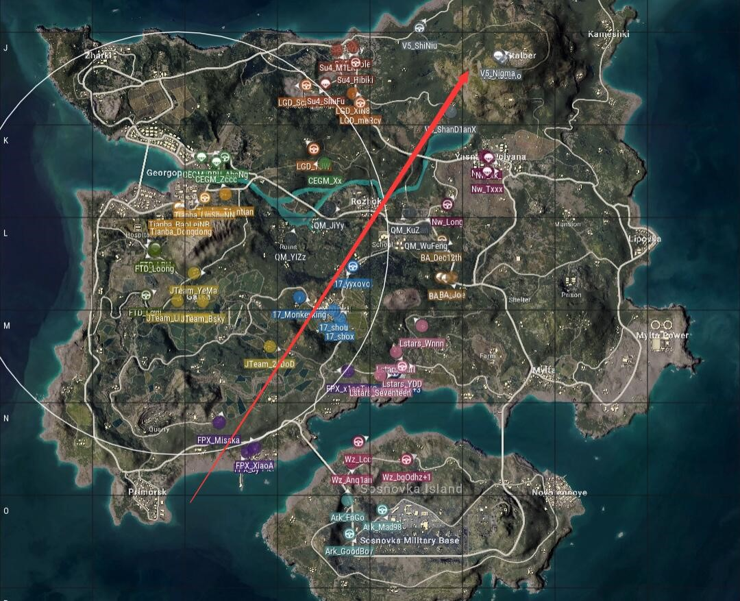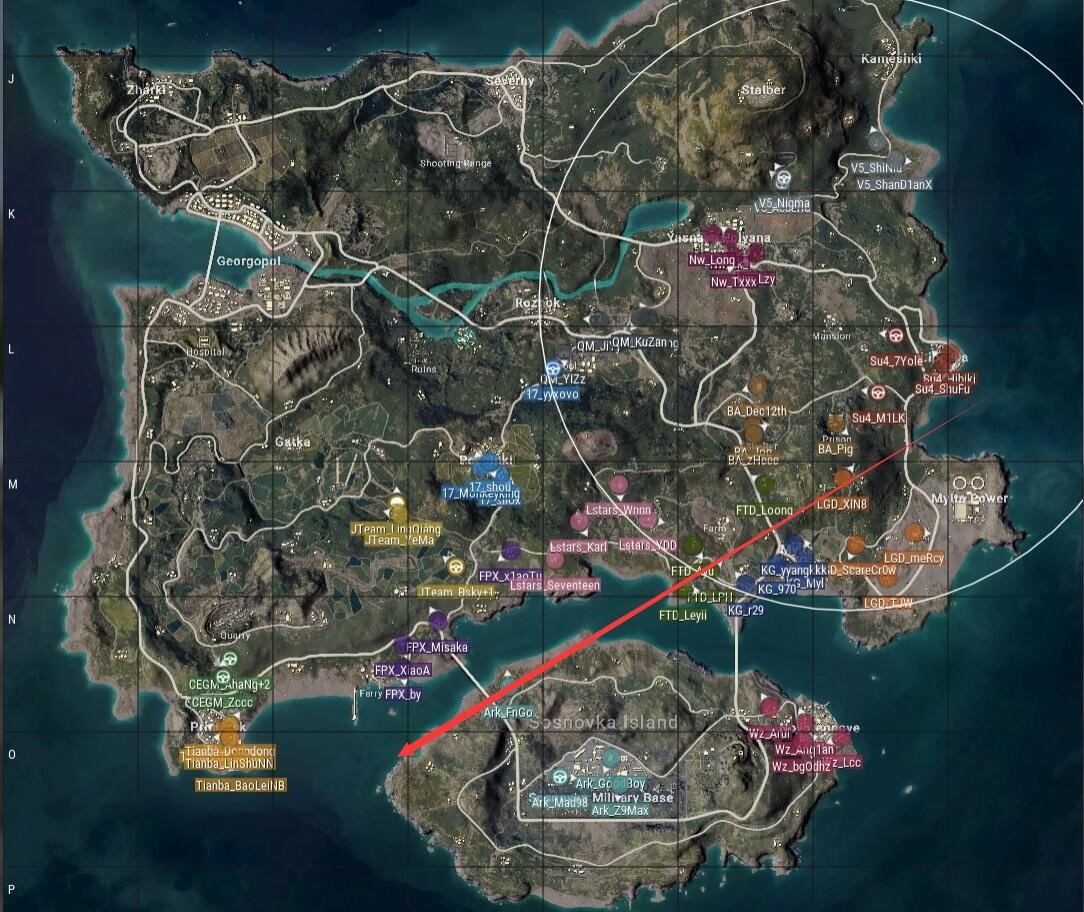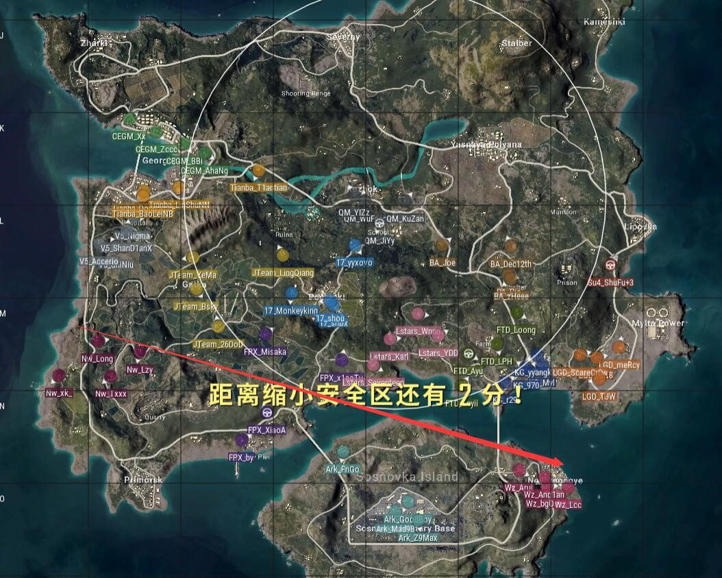 本局比赛采用海岛图,飞机从右方飞往左下,航线极偏,17去往P城,BA去往防空洞,WZ选择了N港,安全区刷在了地图右下角,以监狱为中心。
