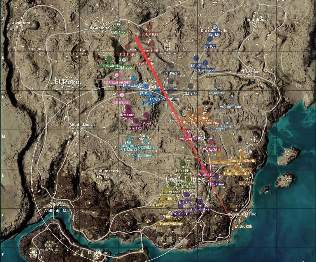 本局比赛采用沙漠图,飞机从右下飞往上方,航线偏右,Ark去往皮卡多,17去往圣马丁,FTD选择了狮城。安全区刷在了地图左下部分,以轴承高地为中心,圈内队伍很少。