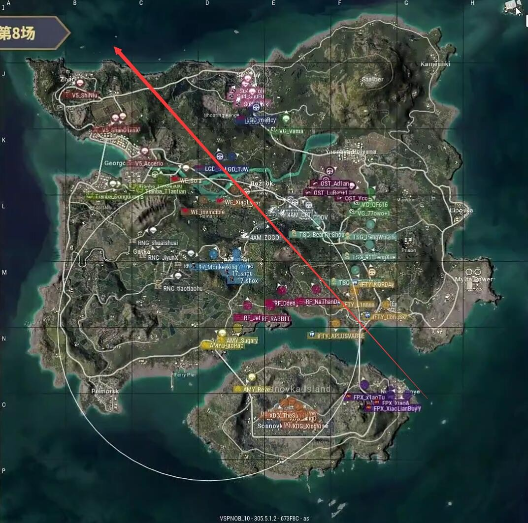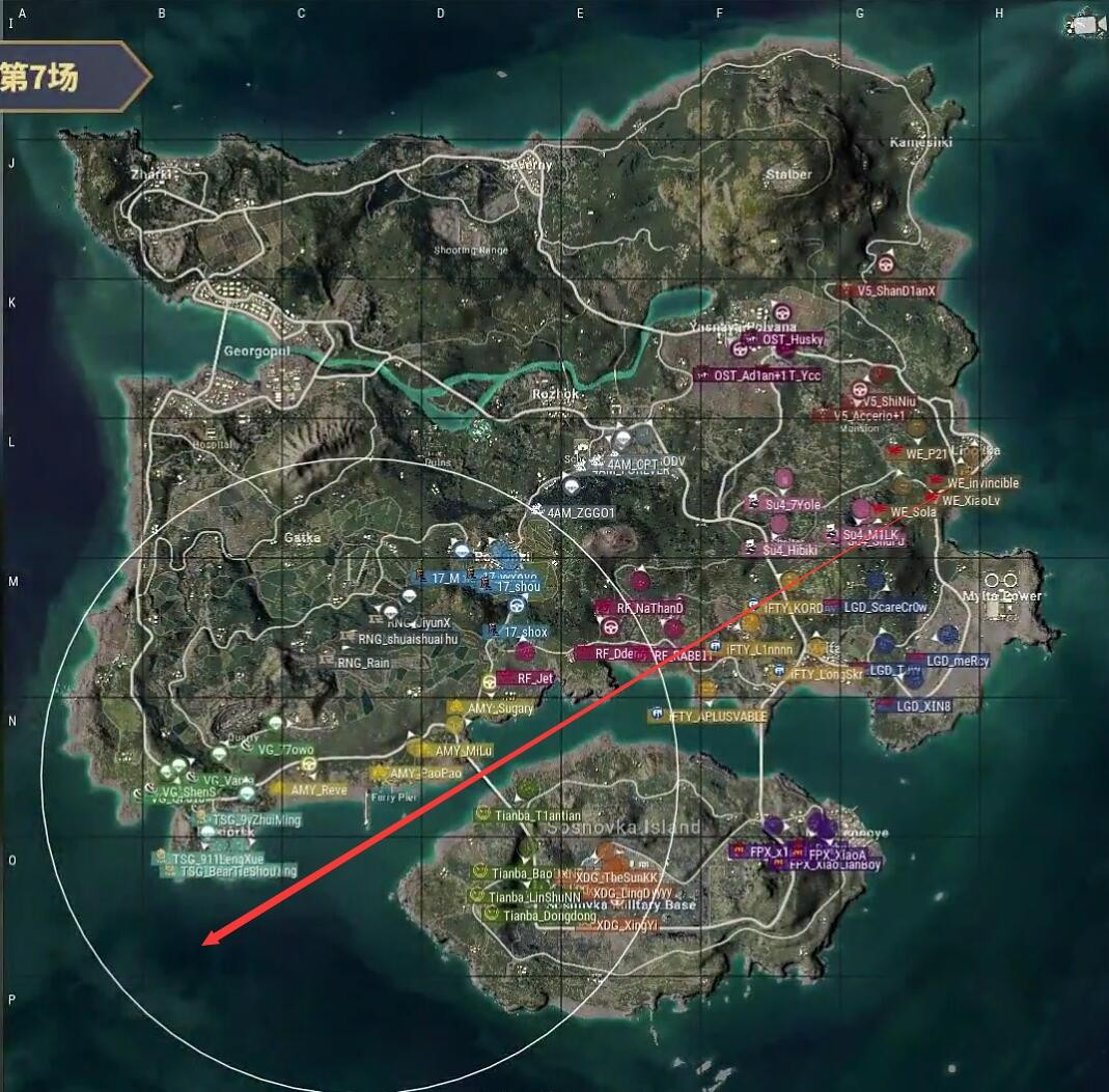 今天的倒数第二场比赛开始,依旧是艾伦格地图,航线从L港飞往P港,17战队占据老家P城,FPX来到N港,第一个圈刷往地图东南部,包含一半的机场岛屿,AMY占据最好的位置。