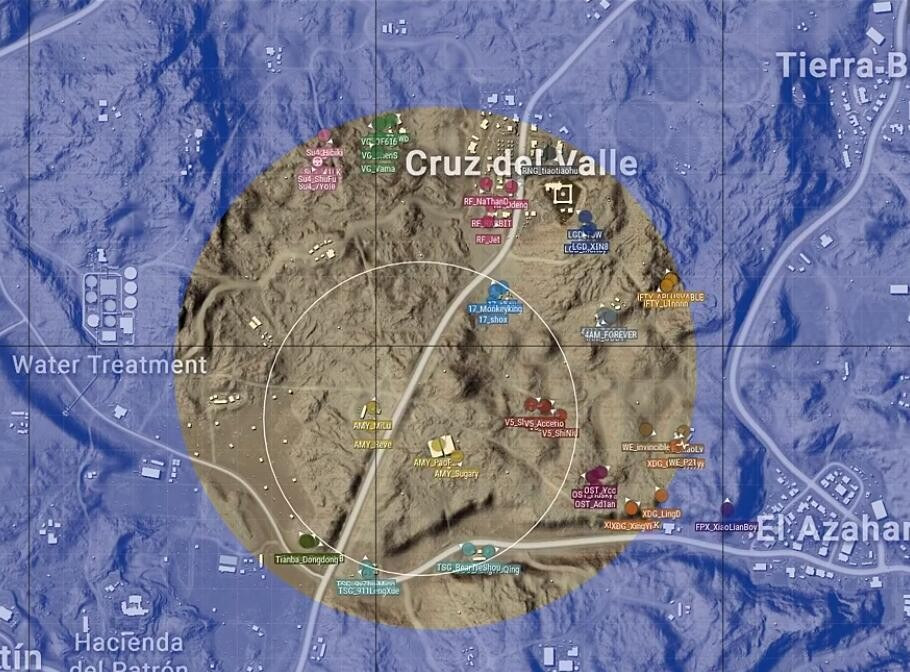 今天的第一场比赛打响,来到米拉玛地图,航线从七点半方向飞往三点钟方向,17依旧跳往圣马丁,目前积分排名第一的TSG战队飞往轴承高地,第一个圈刷往地图东北部,4am在圈内最好的位置。