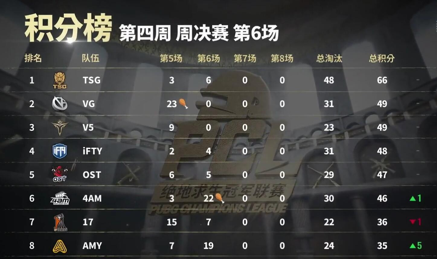决赛圈六支队伍17个生存,17三人占据右边山头,su4和VG都是满编队伍,TSG独狼遭遇AMY两人清点,打倒一人后被两人打掉,左边su4和VG两个满编队交战,VG直接0损失将su4四人淘汰,圈往左边切,VG四人占据圈内大部分位置,其余三人想要进圈都要过马路,VG死死架住,V5先被淘汰,梅花桩刷新,三队混战,猴王一颗雷炸死AMY两人,但被VG架死没能进圈,VG满编成功拿下今天第一鸡!