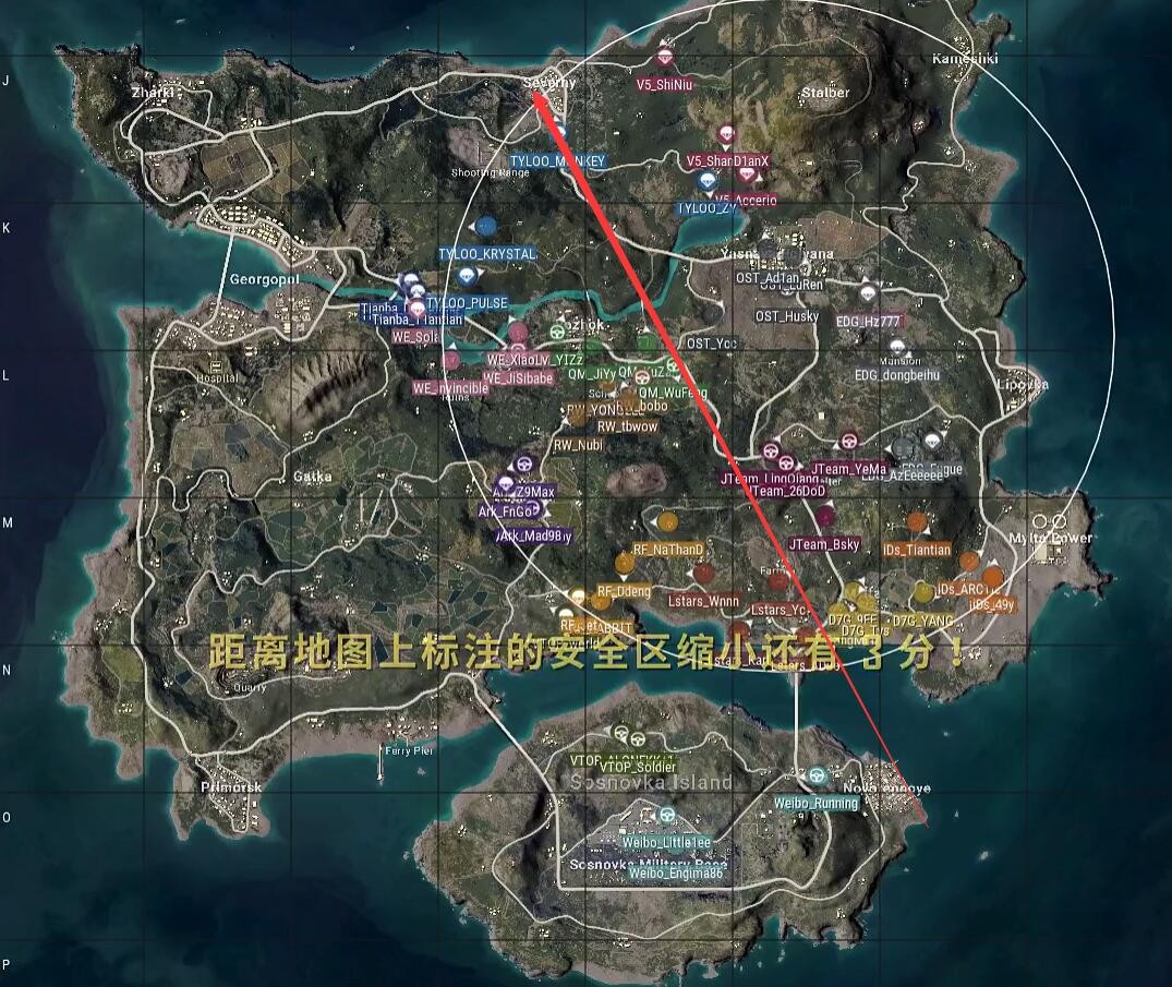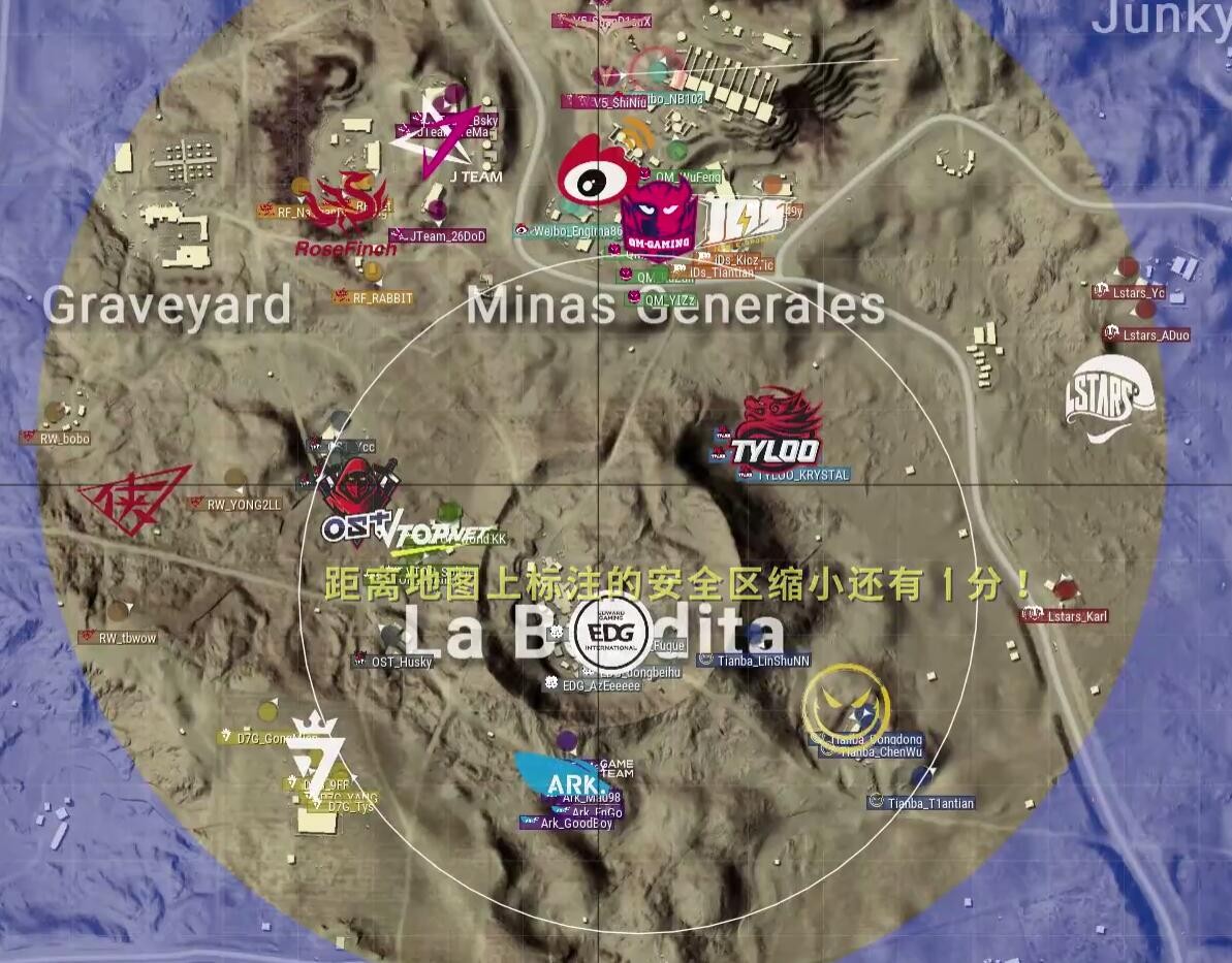 圈4南切,EDG占据了中心位置,Ark、Tianba、OST等队伍都在圈内。