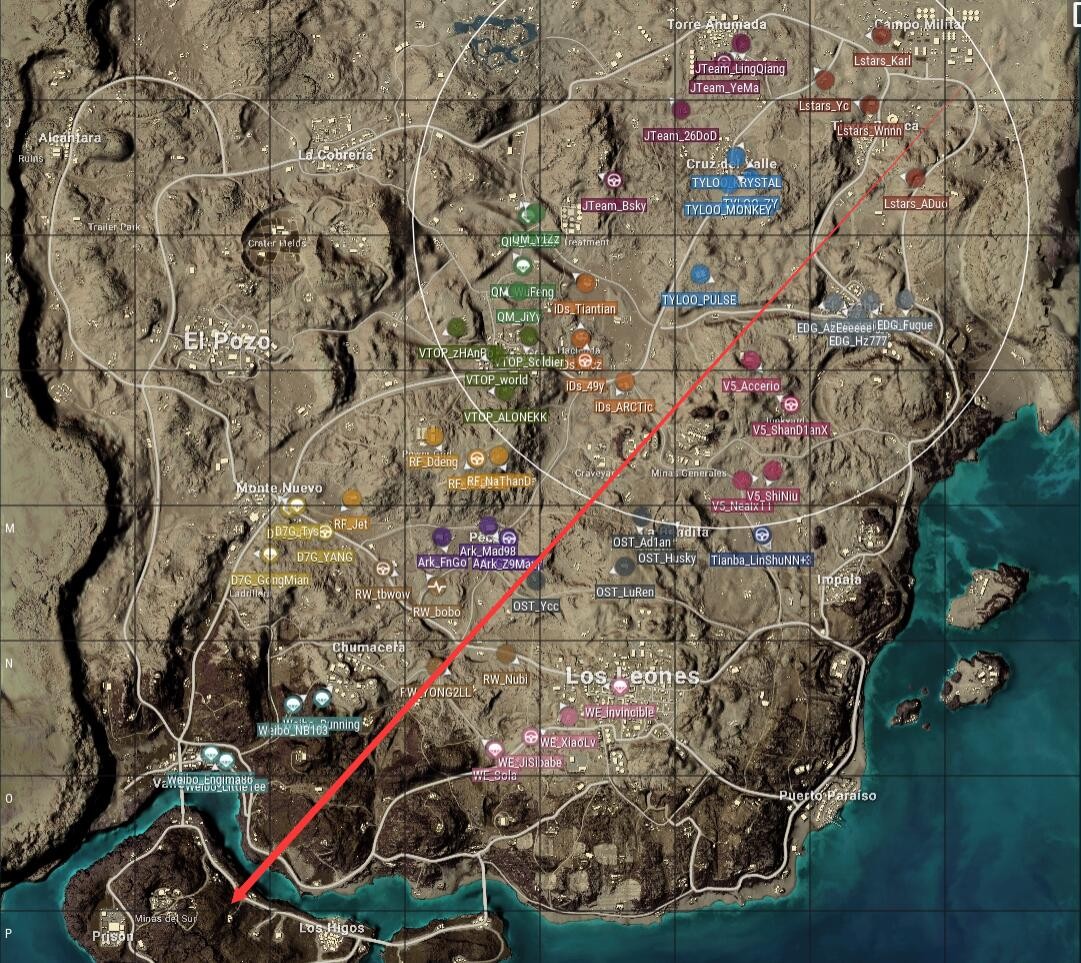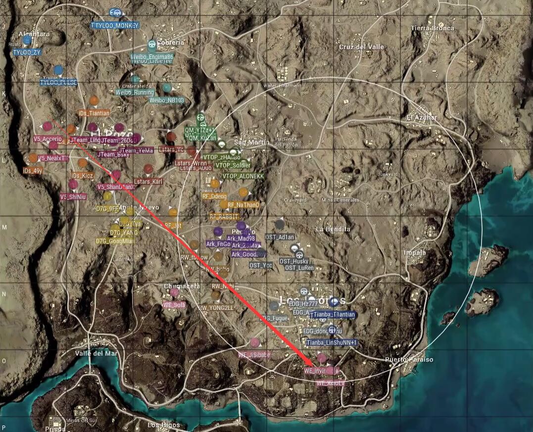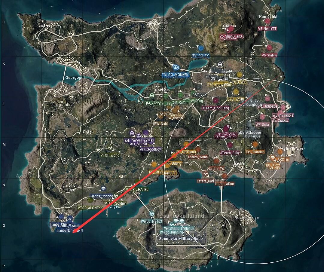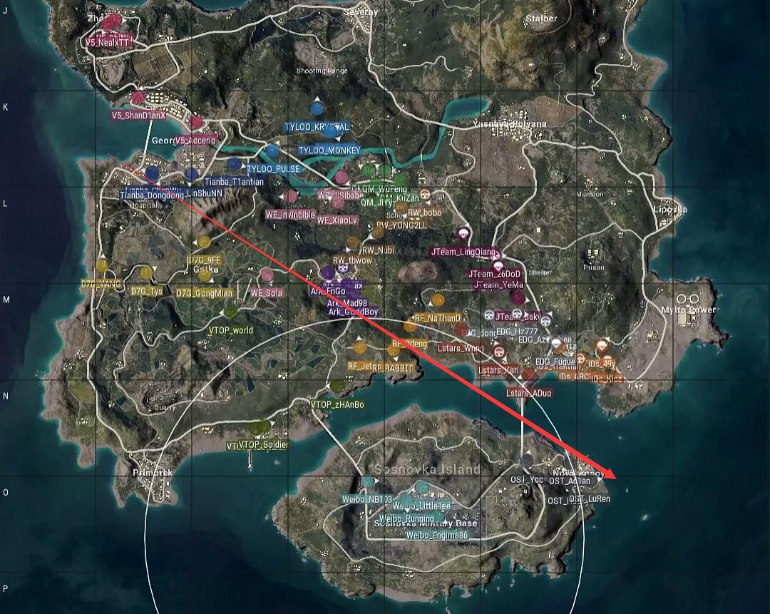 本局比赛采用海岛图,飞机从右上飞往左下,从L港上方飞往P港下方,航线略偏下,IDS去往大电厂,Tianba选择了P港,RF去往二狗家,安全区刷在了地图右侧,包含小半海域。
