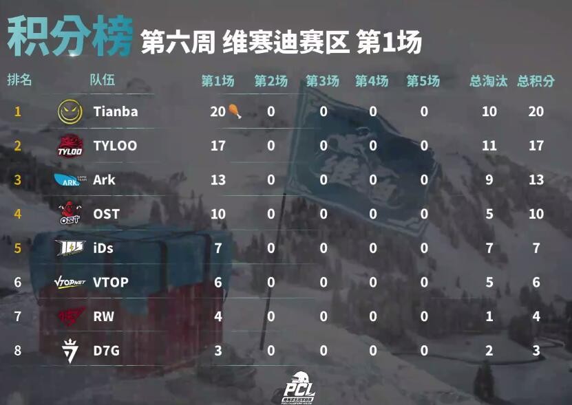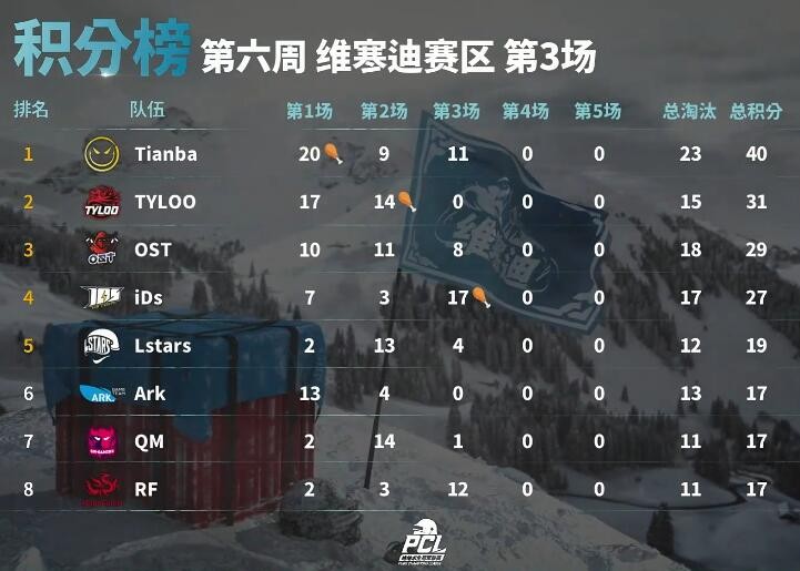 圈6开始收缩,场上还剩6队21人。Lstars被TYLOO多枪线带走,RW跑步进圈被OST带走,面对OST与Tianba的联合冲击,TYLOO损失多人。最终1V1时刻,TYLOO独狼转移遭遇Tianba队员埋伏被淘汰,Tianba成功吃鸡。