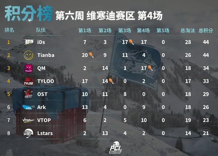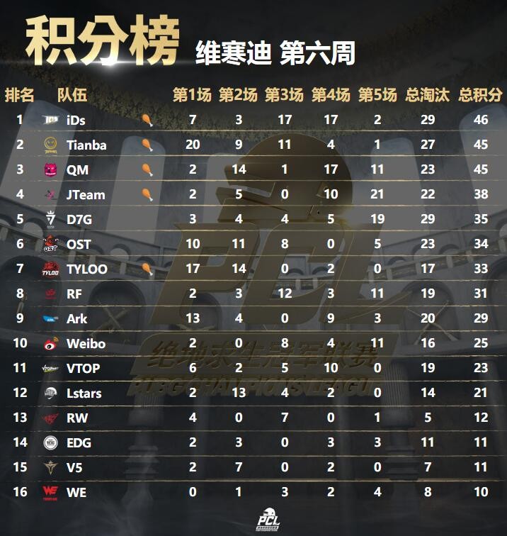 圈6刷新,场上还剩6队15人。Weibo在圈边淘汰Lstars,自己也被Tianba带走。IDS满编占据优势地形,全面拉开枪线,Tianba先被淘汰出局,RF随后被带走,IDS成功吃鸡。
