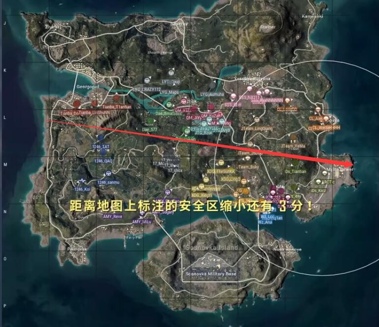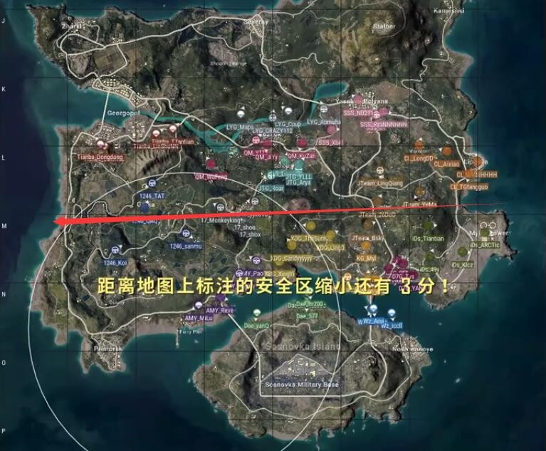 本局比赛采用海岛图,飞机从右往左,从大电厂上方飞往西部荒野,航线非常平均将大地图一分为二,17选择了P城,SSS选择了Y城,JTG选择去往学校,安全区刷在了地图左下方,是一个阴阳圈。