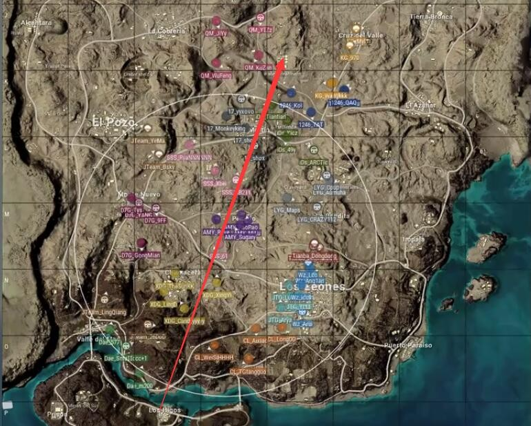 本局比赛采用沙漠图,飞机从下往上,航线居中比较平均。17去往圣马丁,AMY去往皮卡多,WZ与JTG选择去往狮城,安全区刷在了地图左下部分,以皮卡多下方为中心。