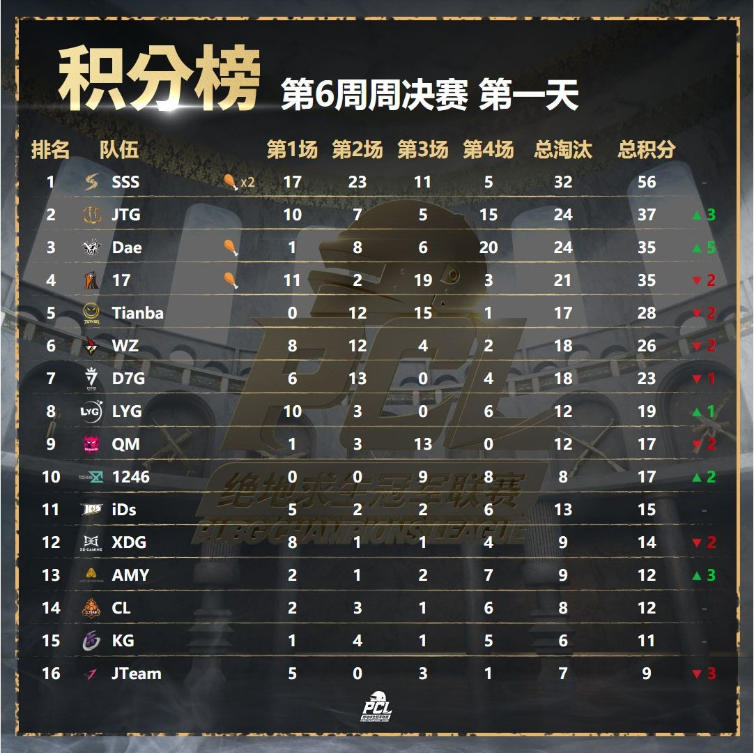 圈6刷新,场上还剩8队21人。17shou化身伏地魔带走AMY两人,再次起身带走LYG数人,最终自己阵亡。JTG占据天命房区瞬间淘汰XDG,决赛圈场上还剩2队7人。决战时刻,SSS拉开枪线将JTG包围在房区并且受到天命眷顾,蓝圈开始收缩,JTG封烟进圈,但被SSS架住,JTG选择在蓝圈外阵亡,SSS成功吃鸡。