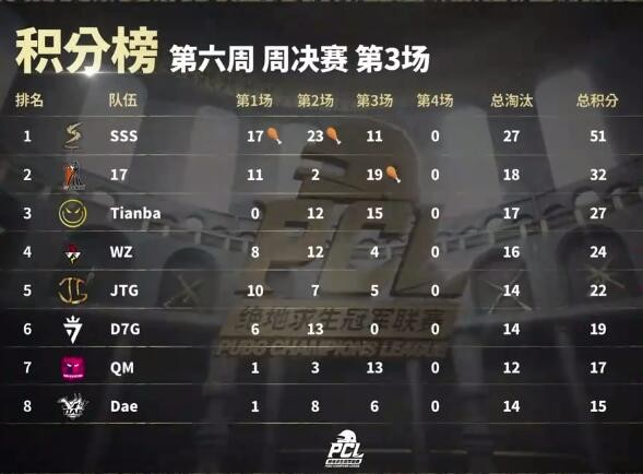 圈6开始收缩,场上还剩8队25人。P港开启混战模式,17强行开车被带走,IDS从D7G背身突然出现可惜被反打带走,KG与Tianba在烟中混战,最终Tianba成功拿下厕所。SSS左右开弓拿到多个人头,士气高涨的他们主动进攻D7G,场上三方混战D7G先被淘汰,决战时刻,61发挥出色淘汰对手再次为SSS拿到一鸡!