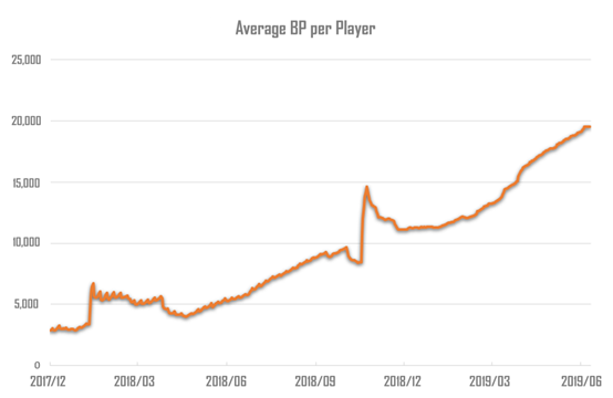 然而,通过上图我们可以发现,实际上随着游戏时间的增加,玩家们库中的BP并没有被消耗掉,反而在不断累加。我们意识到,我们有必要对BP用不掉且会不断累积的游戏环境进行改善,给玩家们提供更多的选项,让玩家们能更好地享受游戏。