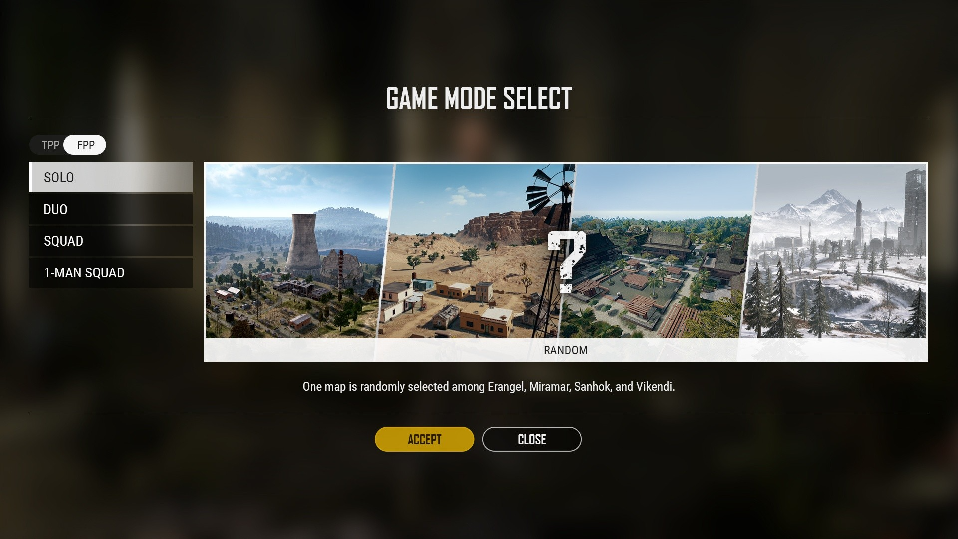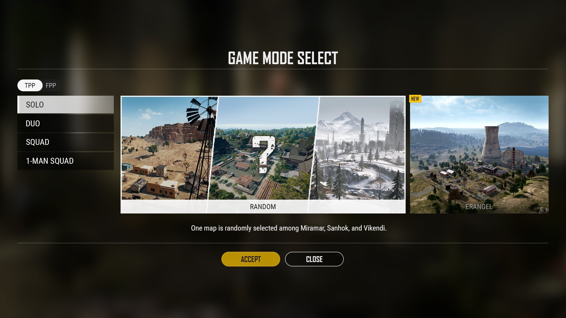 - 将在FPP/TPP模式中提供一张推荐地图(新视界艾伦格)与剩余的地图中随机选取一张进行游戏的“随机”选项。