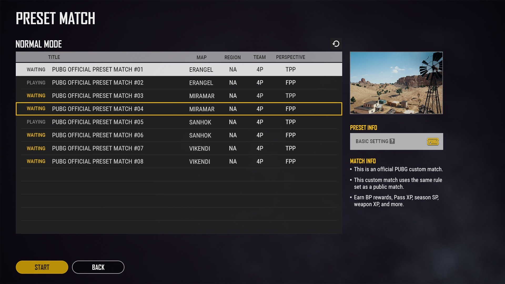 - 预设匹配由PUBG官方提供的特定模式、地图的房间构成,玩家们可以进入自己的喜好挑选房间并进行游戏。